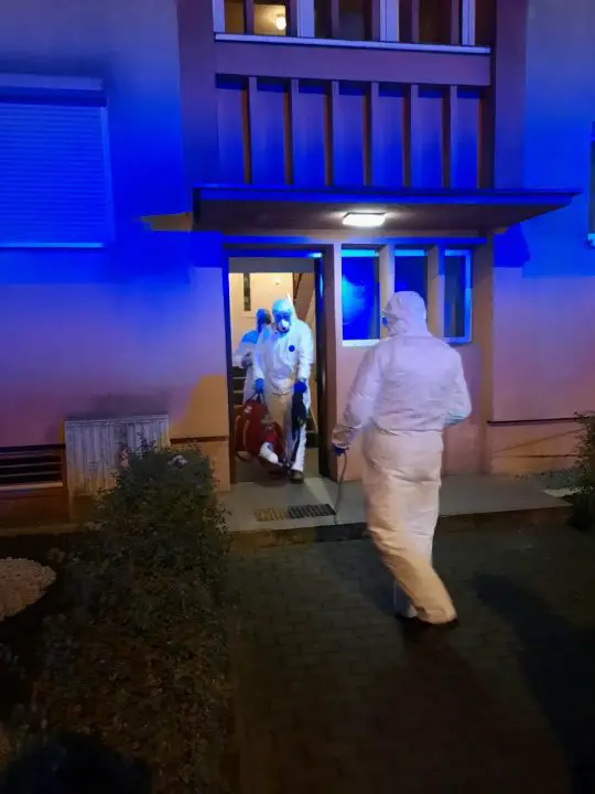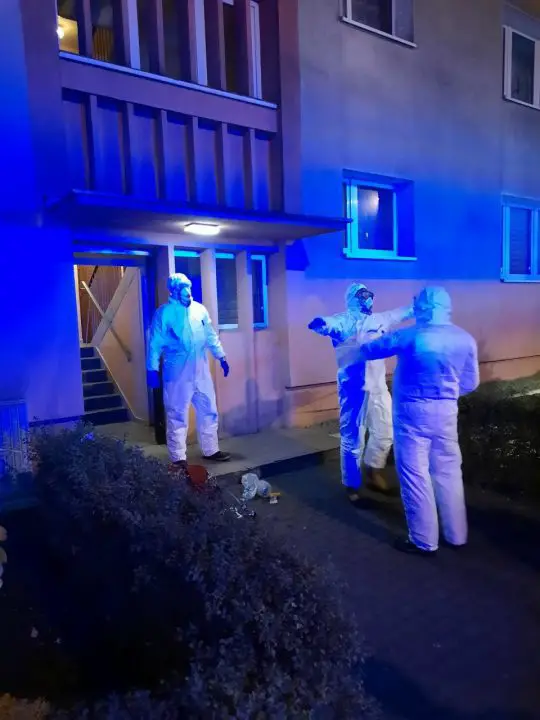 Po przybyciu zadysponowanych zastępów i rozpoznaniu ustalono,że mężczyzna znajdował się wpokoju w pozycji półsiedzącej, kontakt utrudniony. Działania JOP polegały na zabezpieczeniu miejsca zdarzenia, rota w sprzęcie OUO sprawdziła przy pomocy detektora wielogazowego pomieszczenia pod kątem obecności tlenku węgla – urządzenia wykazały 0 ppm. Druga rota zabezpieczona w ubrania typu TYVEK kat.III,maseczki FFP3 oraz rękawiczki nitrylowe z zestawem R-2 weszła do mieszkania, gdzie znajdował się mężczyzna. Rozpoczęto udzielanie kpp, gdzie po kilku minutach mężczyzna stracił przytomność. Ratownicy przystąpili do RKO przy użyciu AED. Męzczyzna został przekazany przybyłemu na miejsce zdarzenia ZRM. Następnie wraz z zespolem ratownictwa medycznego kontynuowane było RKO. Po kilkudziecięciu minutach będący na miejscu lekarz stwierdził zgon mężczyzny.Udział 2 zastępy 8 ratowników, Policja, ZRM.