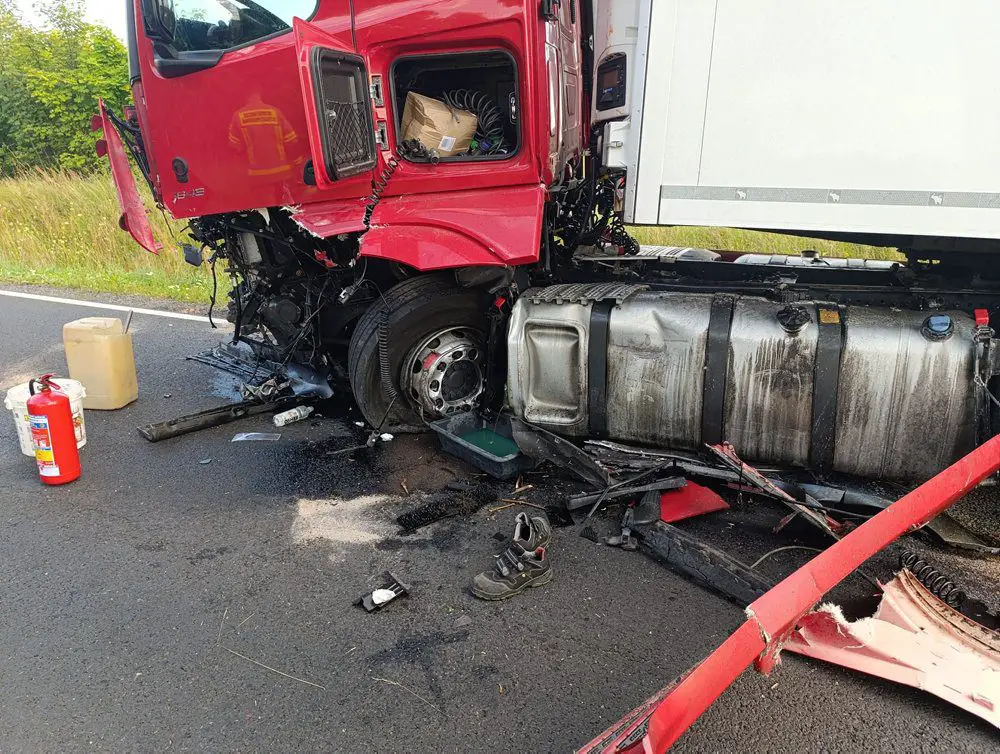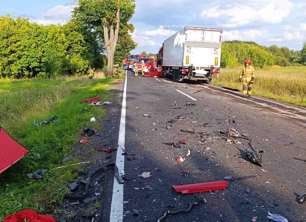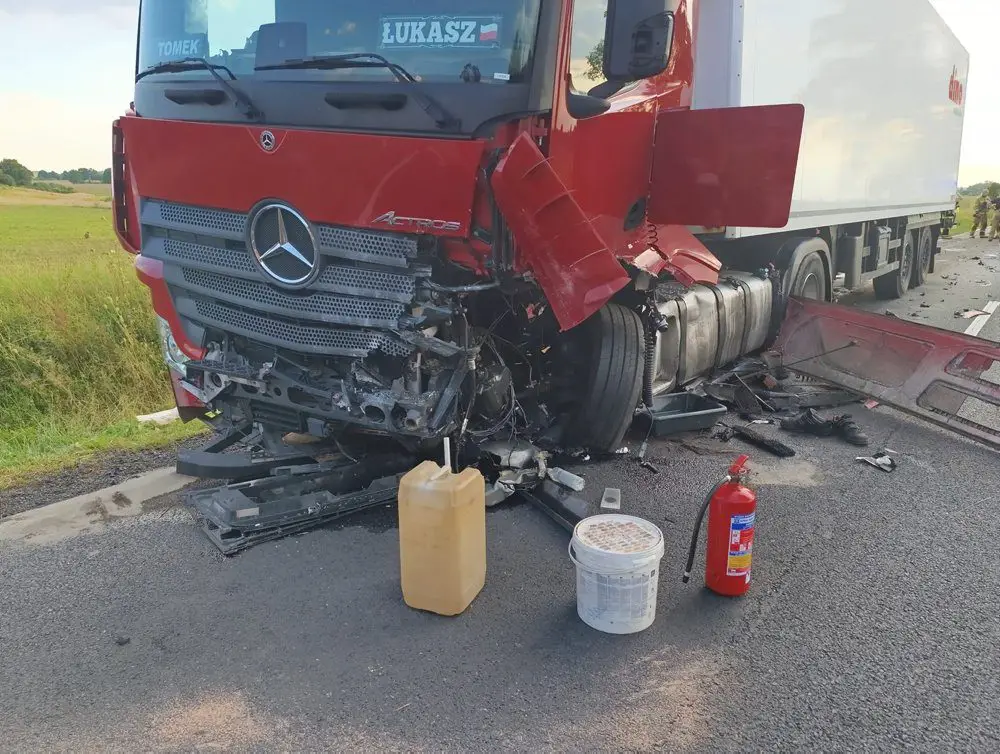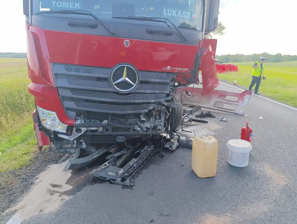 Osobowy Mercedes z niewyjaśnionych jeszcze przyczyn zjechał na przeciwległy pas ruch. Tam doszło do czołowego zderzenia ciężarówką.