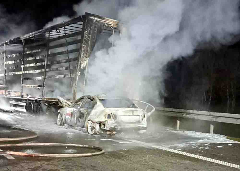Do śmiertelnego wypadku doszło nocą na autostradzie A2 koło miejscowości Prądówka. Osobówka uderzyła w samochód ciężarowy i stanęła w płomieniach.