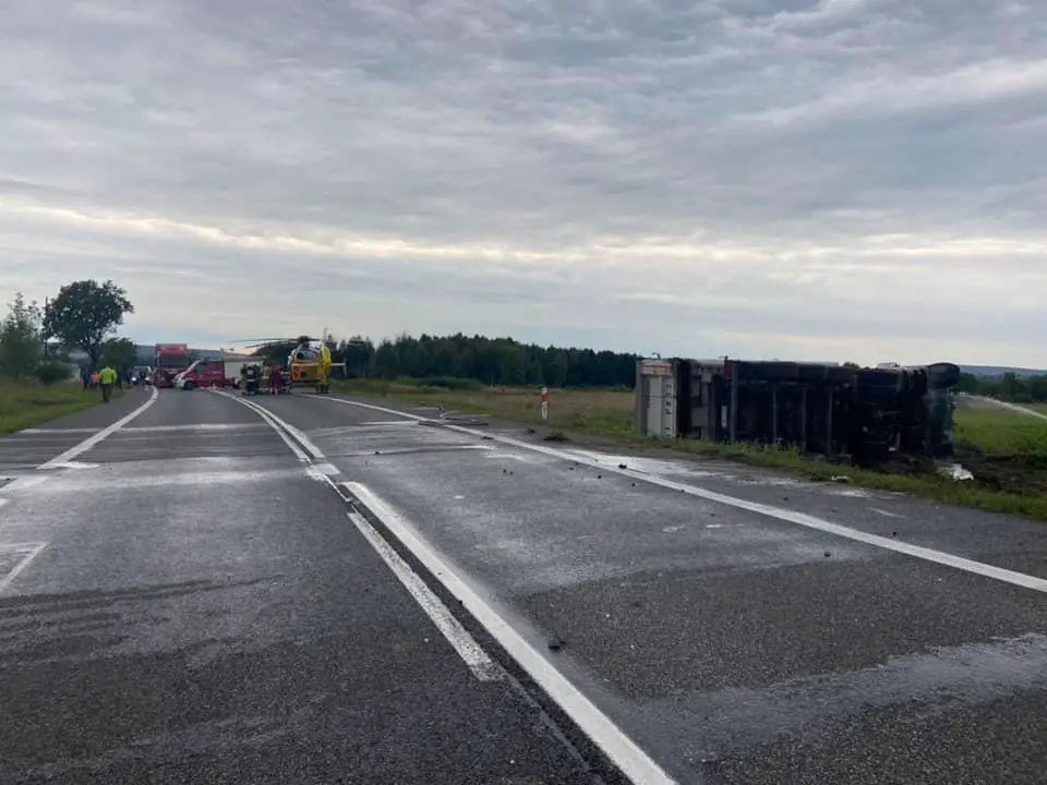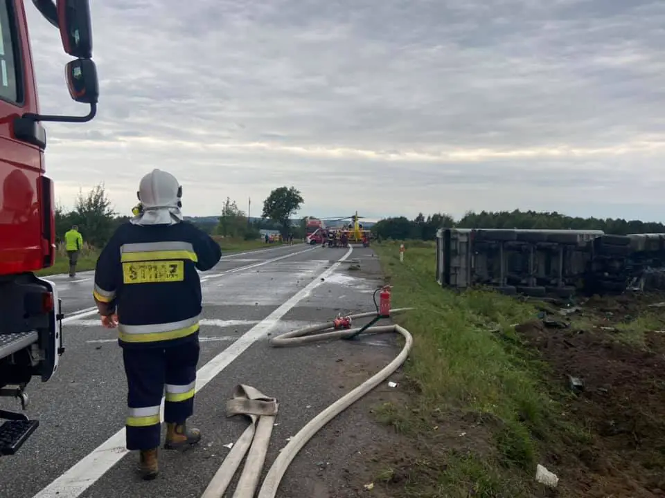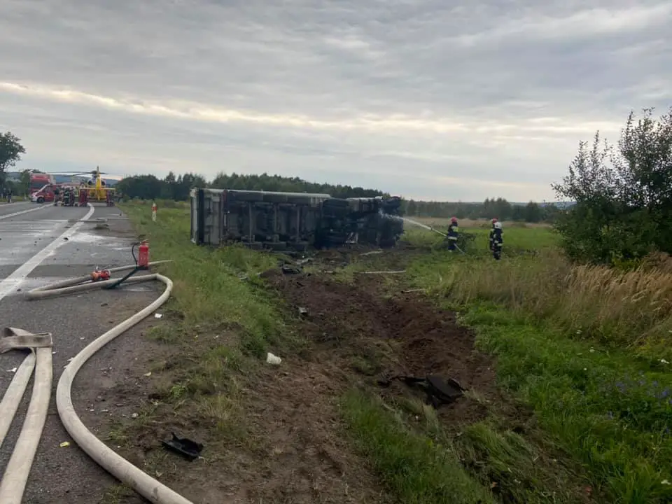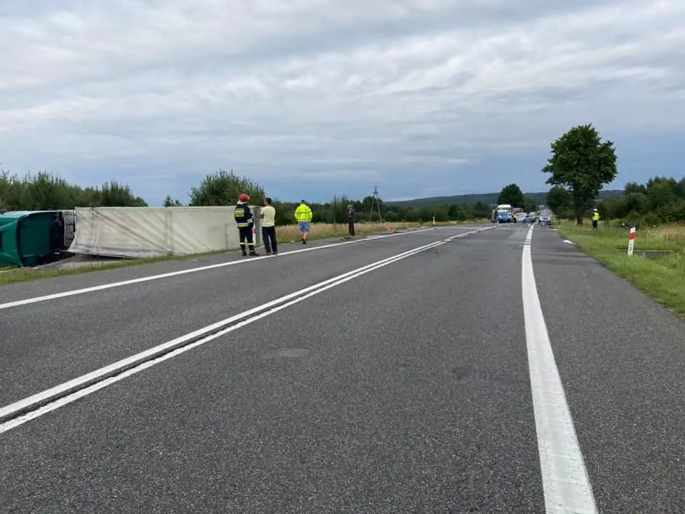 Z drogi wypadła również ciężarówka. Przewróciła się i zapaliła.