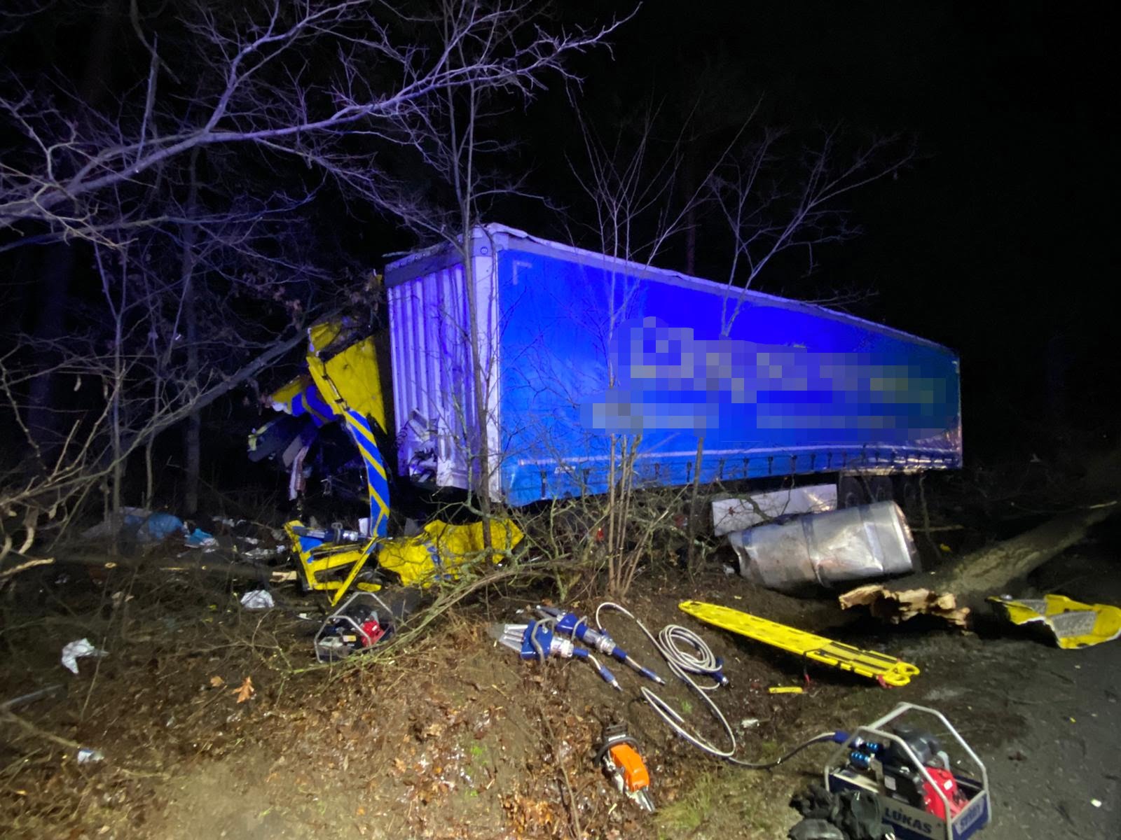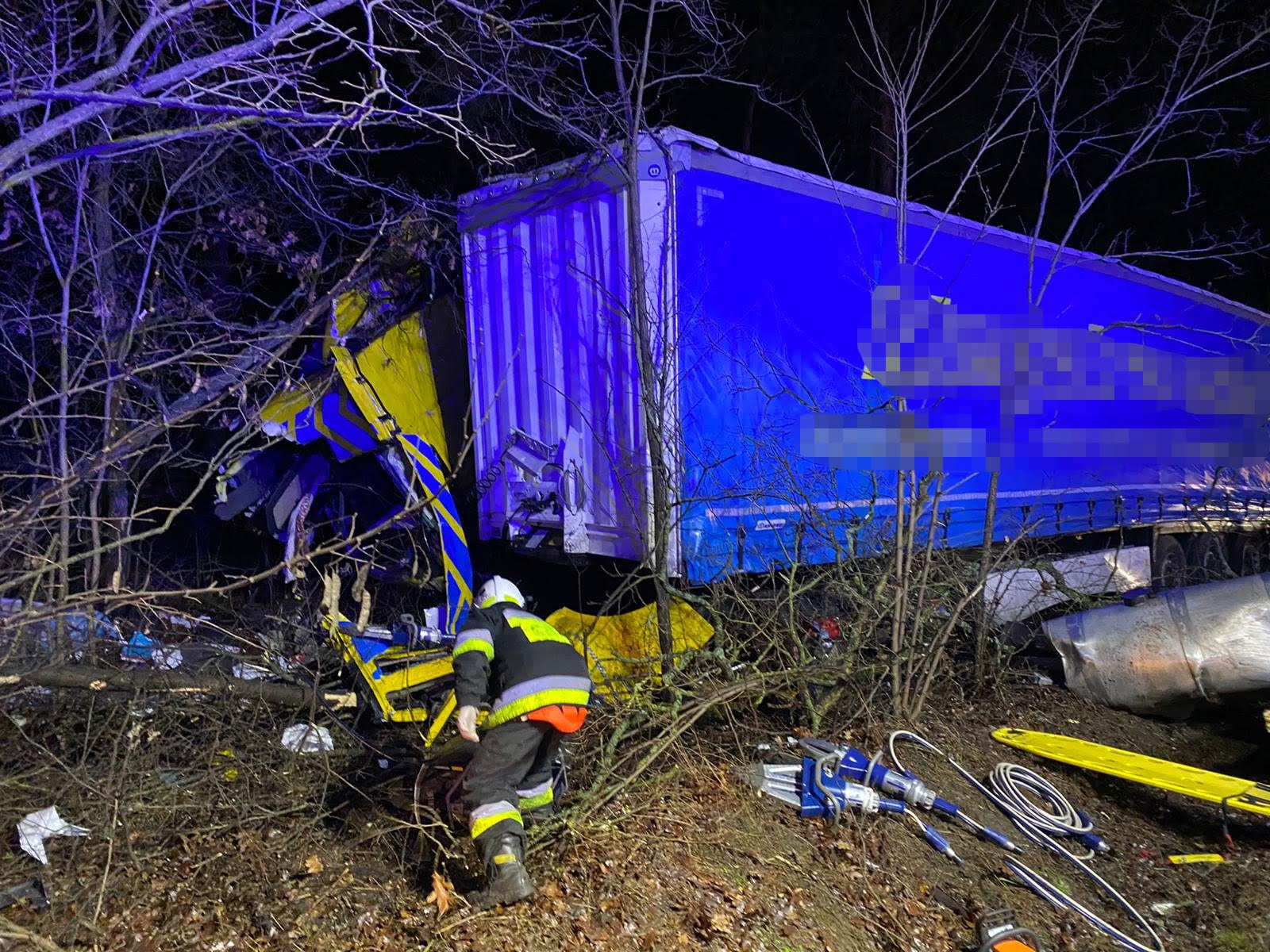 Na miejsce wypadku natychmiast wysłano strażaków zawodowych z Jednostki Ratowniczo-Gaśniczej z Nowego Tomyśla oraz ochotników z Miedzichowa i Bolewic a także zespół ratownictwa medycznego i policję. Po przybyciu pierwszych zastępów straży pożarnej na miejsce zdarzenia zastano samochód ciężarowy z naczepą znajdujący się częściowo na poboczu drogi oraz w lesie. Pojazd uderzył w drzewo, które złamało się i blokowało ruch na jezdni. Nieprzytomny kierowca znajdował się w szoferce bez parametrów życiowych. Samochód przewoził wełnę izolacyjną.