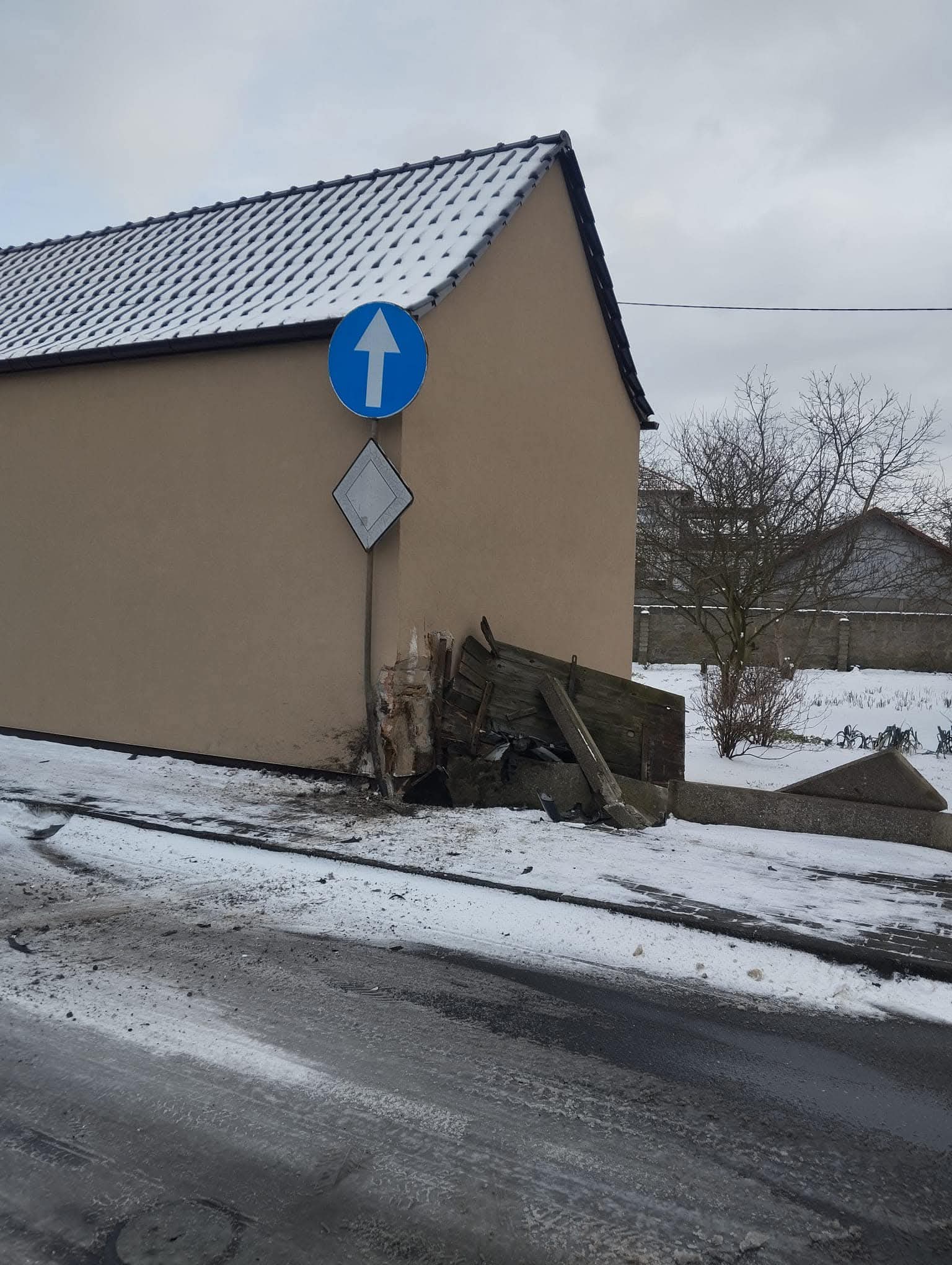 Pijany kierowca uderzył w znak, płot i mur budynku w Poniecu.