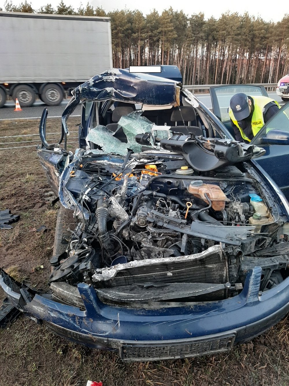 Po uderzeniu volkswagen odbił się od naczepy i padł na bariery oddzielające pasy ruchu. Kierujący doznał jedynie ogólnych obrażeń ciała i został przetransportowany karetką do szpitala w Kępnie.