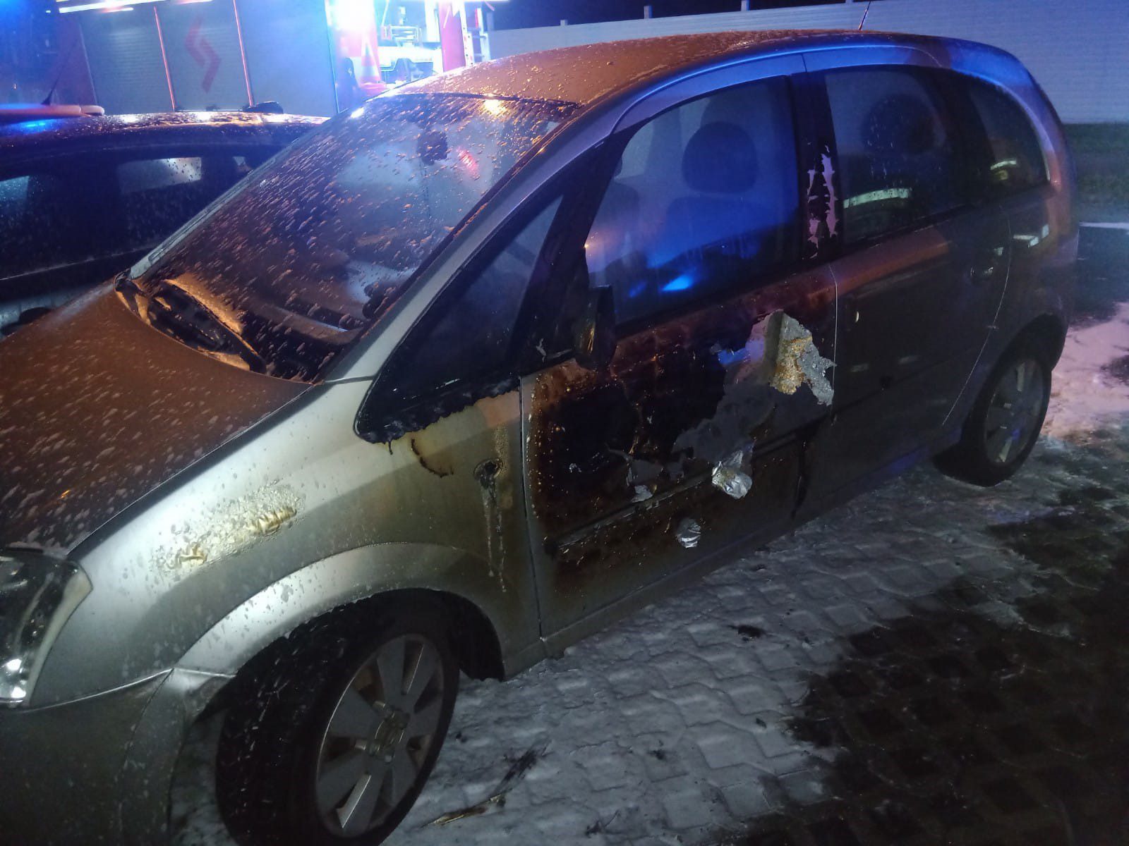 W wyniku oddziaływania cieplnego uszkodzeniu uległ także samochód zaparkowany obok palących się pojazdów – Opel Meriva.