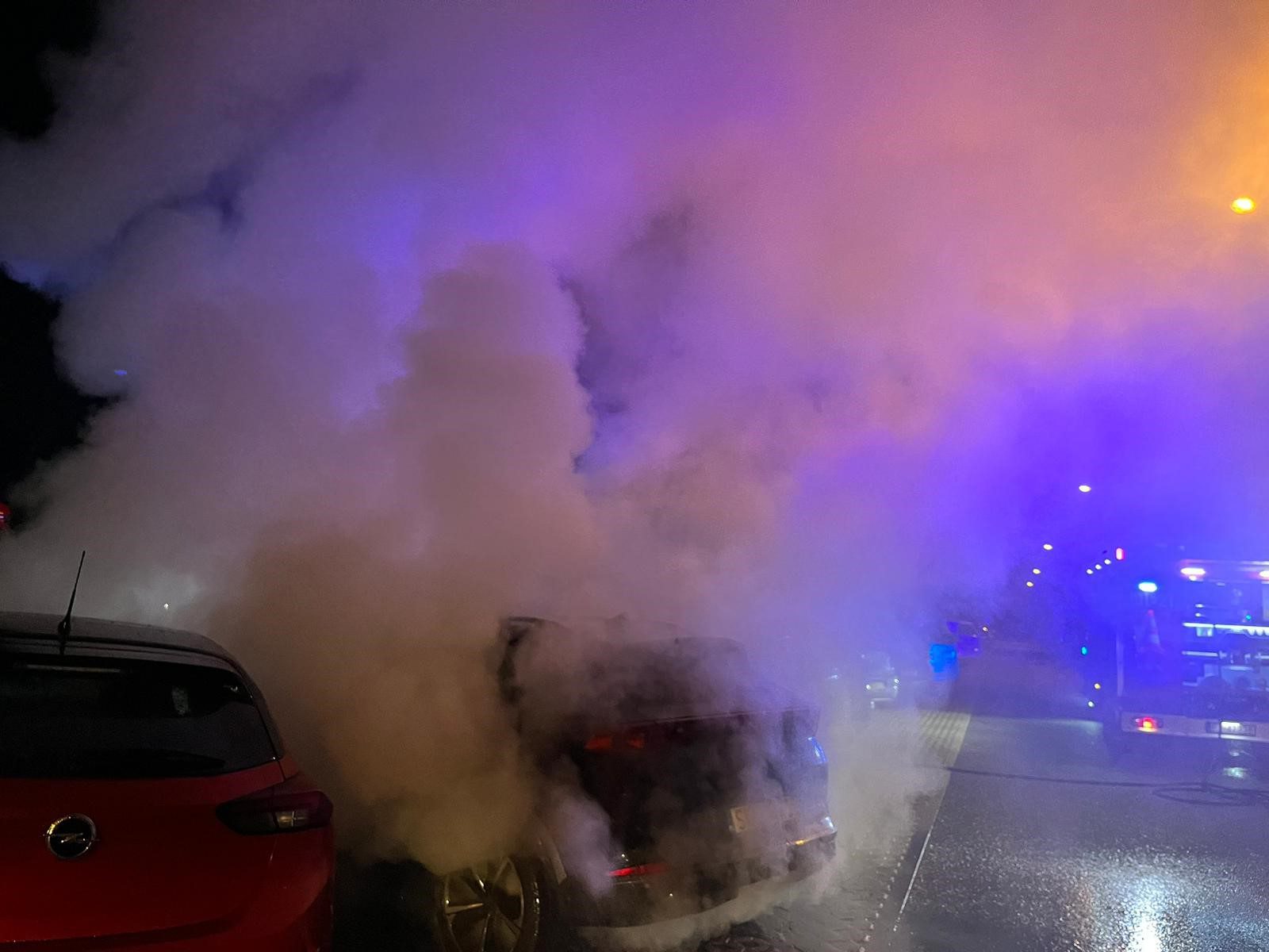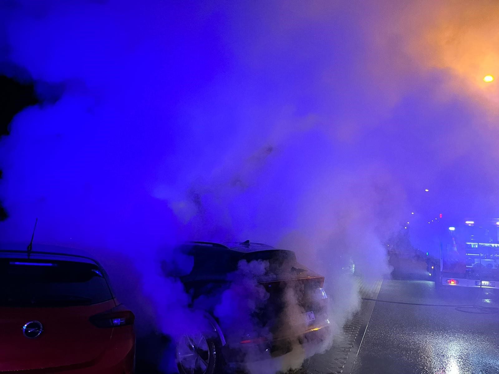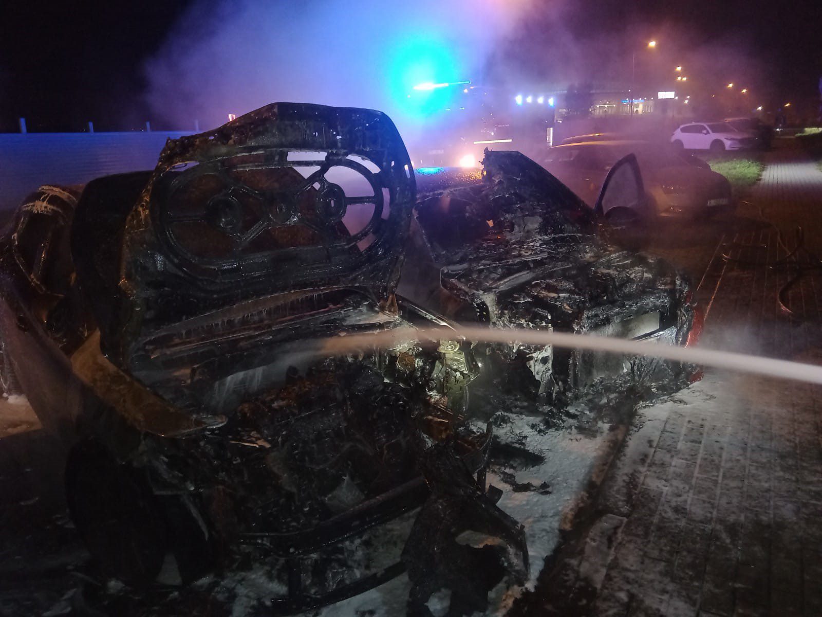 Po przybyciu na miejsce zdarzenia pierwszych podmiotów ratowniczych stwierdzono, że na parkingu pali się samochód osobowy marki Cupra Formentor oraz zaparkowany obok Opel Corsa (samochód z napędem elektrycznym).