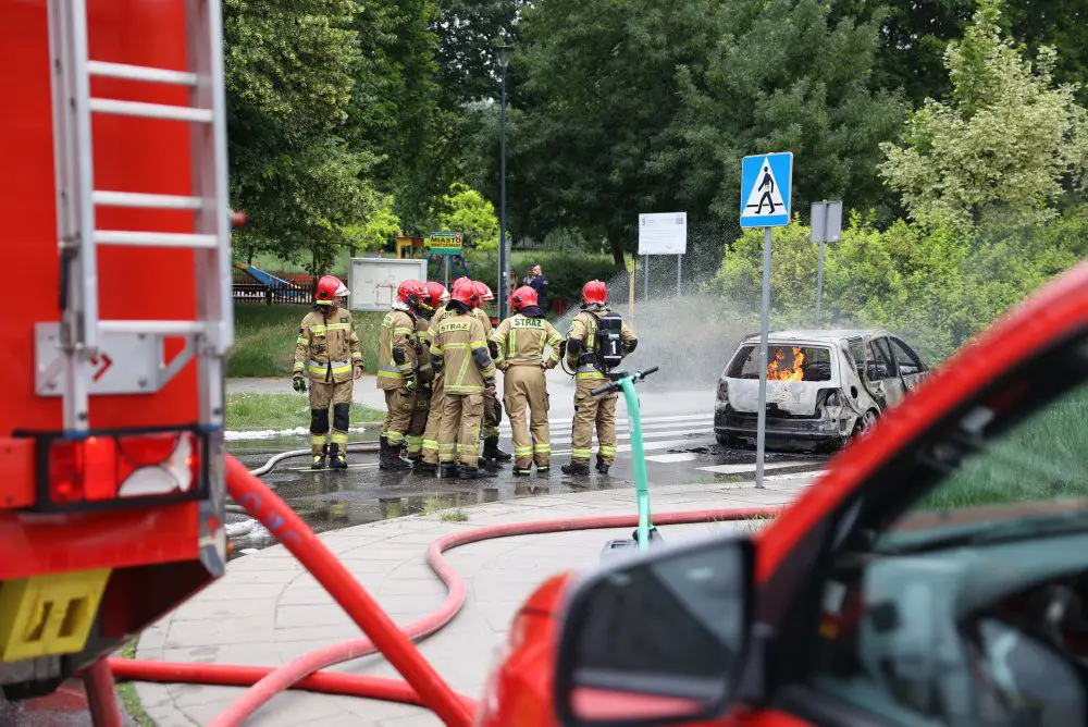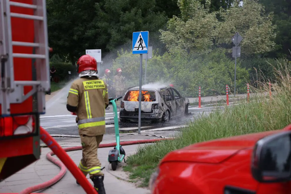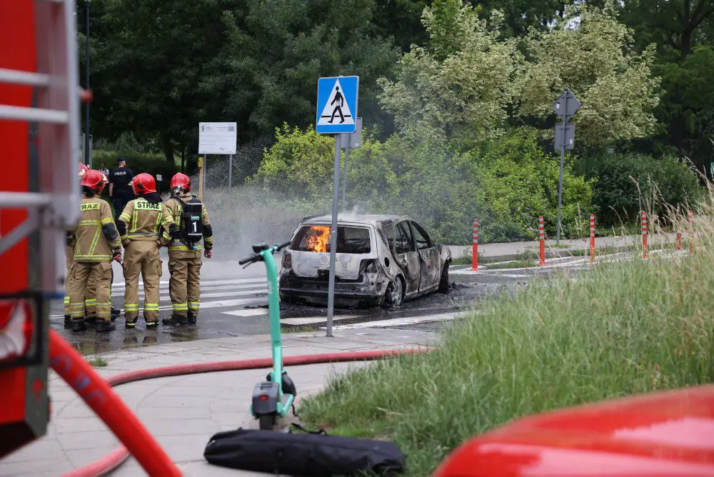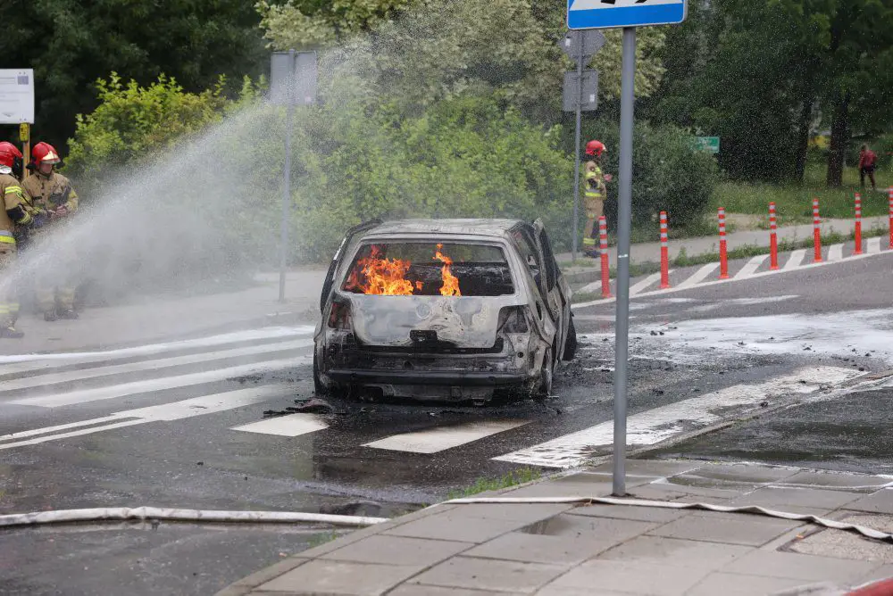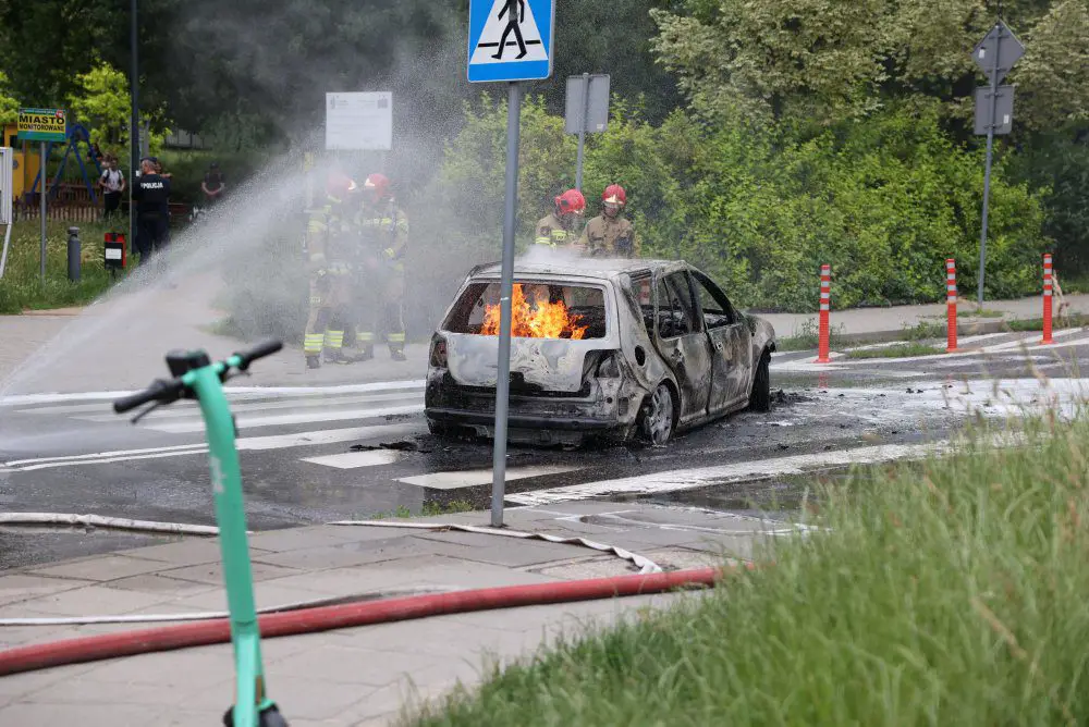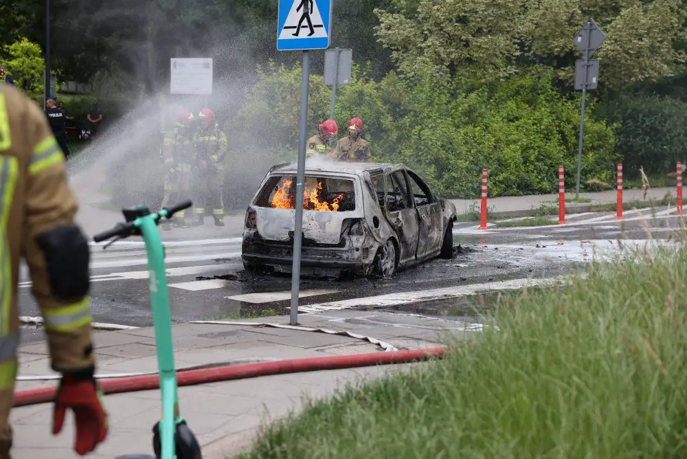Pożar samochodu ugasili strażacy. W środku zostały znalezione zwęglone zwłoki mężczyzny. Temperatura podczas pożaru była tak wysoka, że tablica rejestracyjna wtopiła się w asfalt i musiała zostać wykuta.