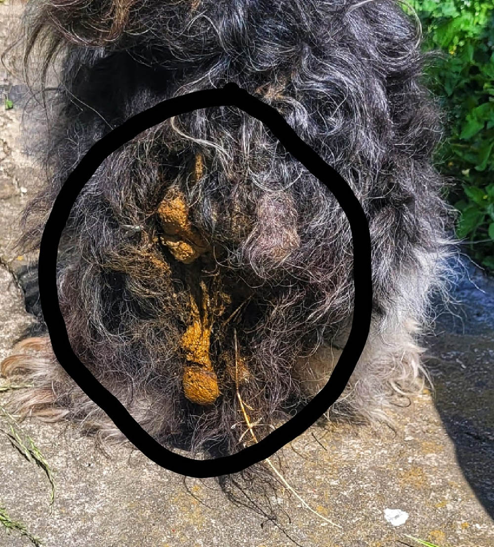 Piesek był z tyłu cały obklejony odchodach. Psinka nie mogła się nawet załatwić. Do tego cuchnęła okropnie.
