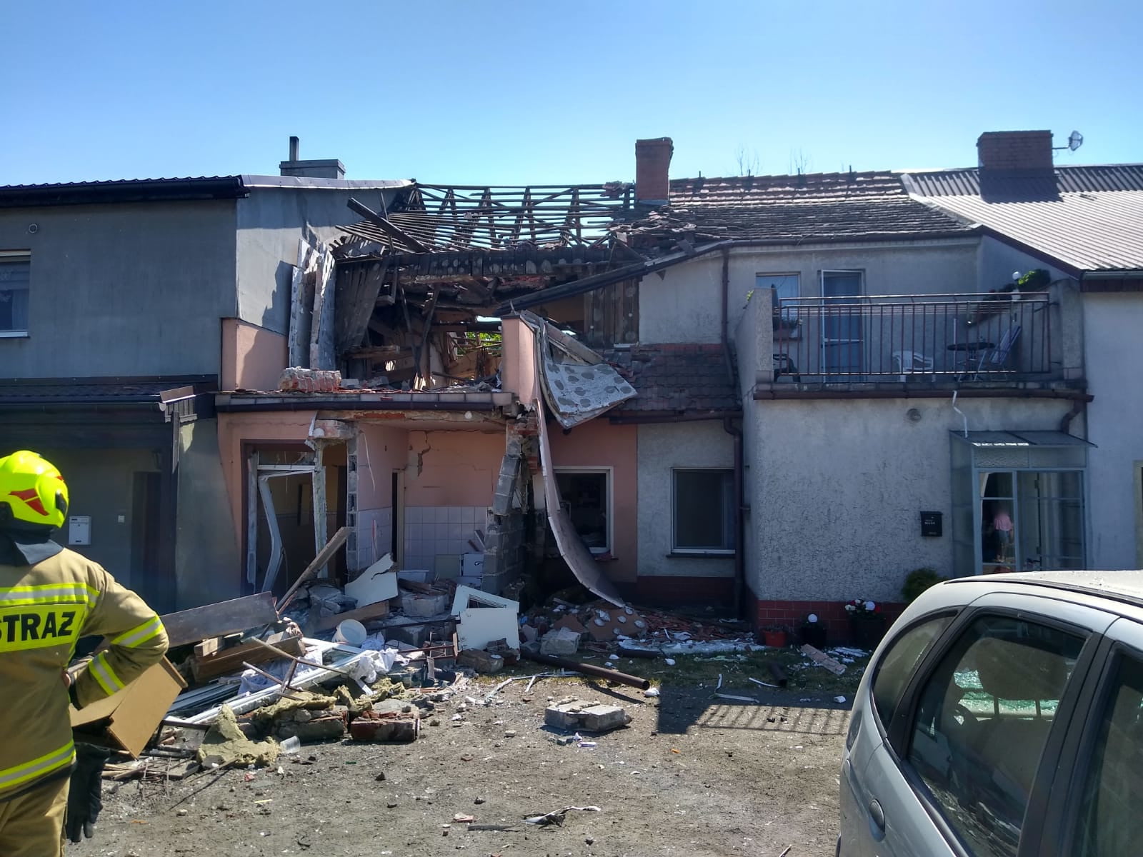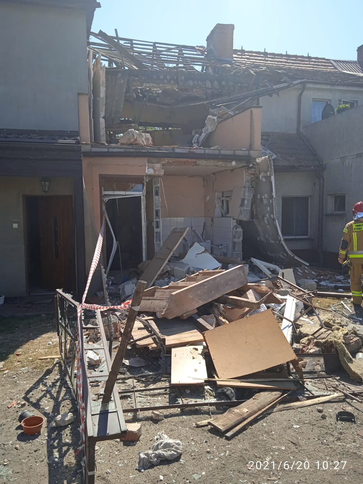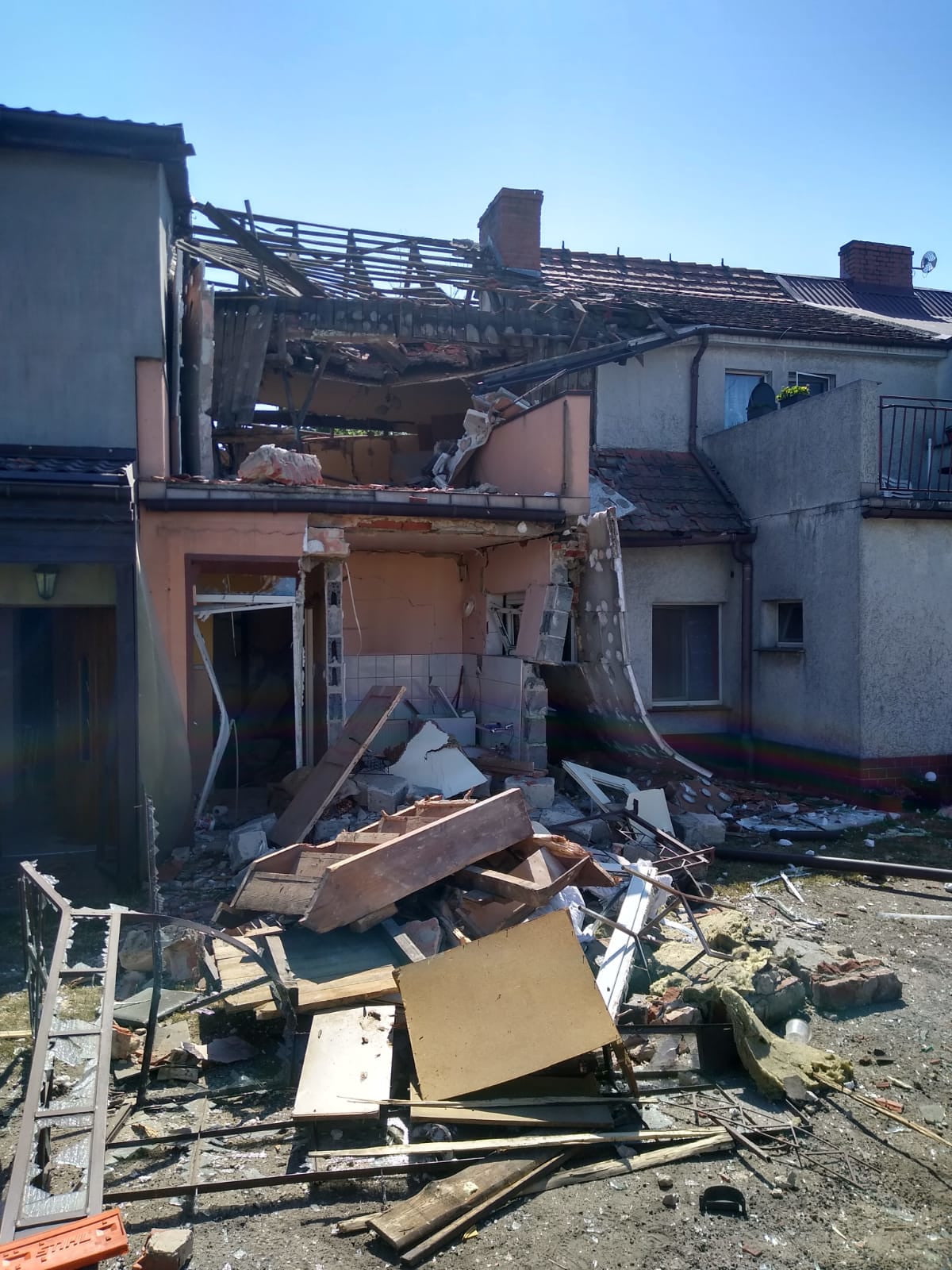 Po dotarciu na miejsce zdarzenia stwierdzono, że doszło do wybuchu w budynku mieszkalnym stanowiącym zabudowę szeregową. W wyniku wybuchu uszkodzeniu uległ segment w którym doszło do wybuchu oraz segmenty z nim sąsiadujące. Wszystkie osoby ewakuowały się z budynku przed przybyciem JOP. Jedna osoba wymaga pomocy medycznej.