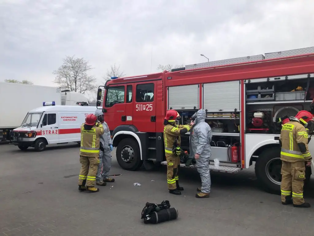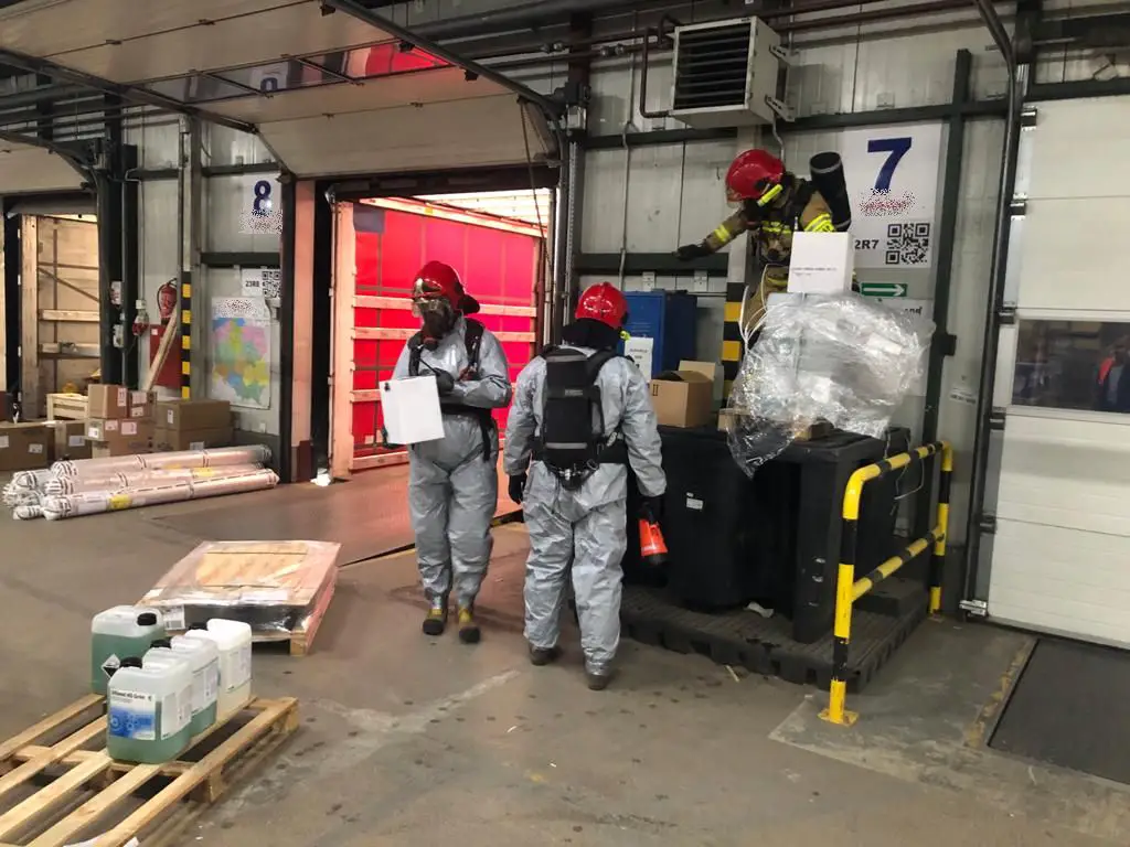 Natychmiastowe działania strażaków polegały na zabezpieczeniu terenu działań, przeprowadzeniu identyfikacji substancji na podstawie dokumentacji. Następnie odpowiednio zabezpieczeni ratownicy udali się we wskazane przez pracownika miejsce wycieku i ograniczyli wyciek środka żrącego. W dalszym etapie działań na osobną paletę przeniesiono nieuszkodzone pojemniki, a uszkodzone opakowanie zamknięto szczelnie i bezpiecznie w pojemniku. Jednocześnie cały czas był kontrolowany czas przebywania ratowników w strefie niebezpiecznej.