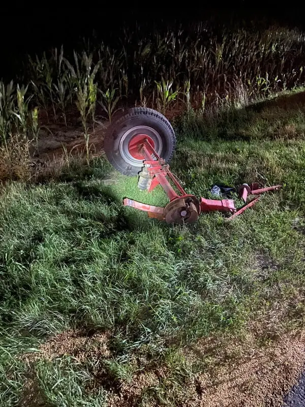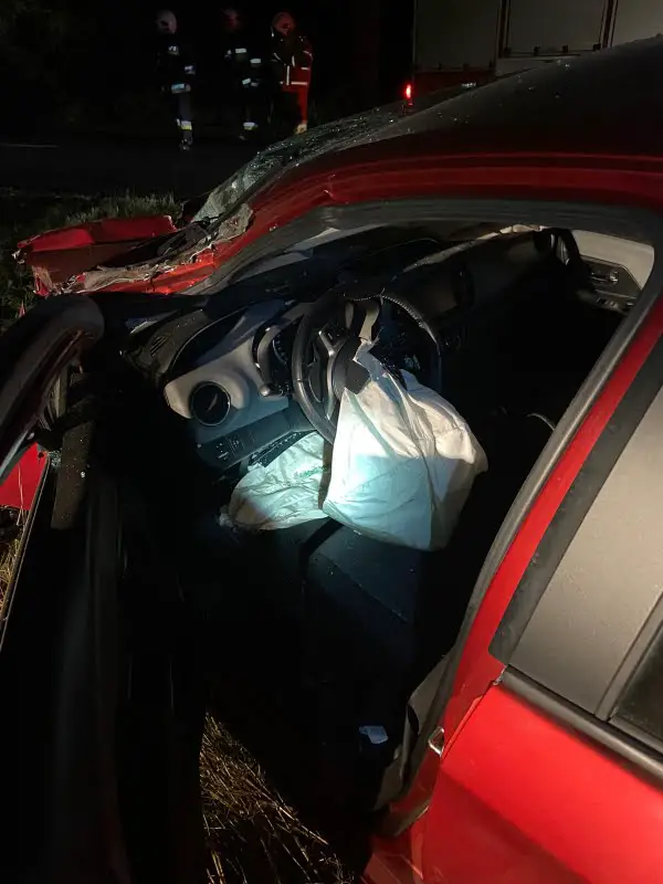 Po dotarciu na miejsce pierwszych zastępów straży pożarnej ustalono, że samochód osobowy uderzył w bok przyczepy rolniczej. Samochód znajdował się na polu na kołach, ciągnik rolniczy wraz z dwoma przyczepami blokował jeden pas drogi, brak osób poszkodowanych.