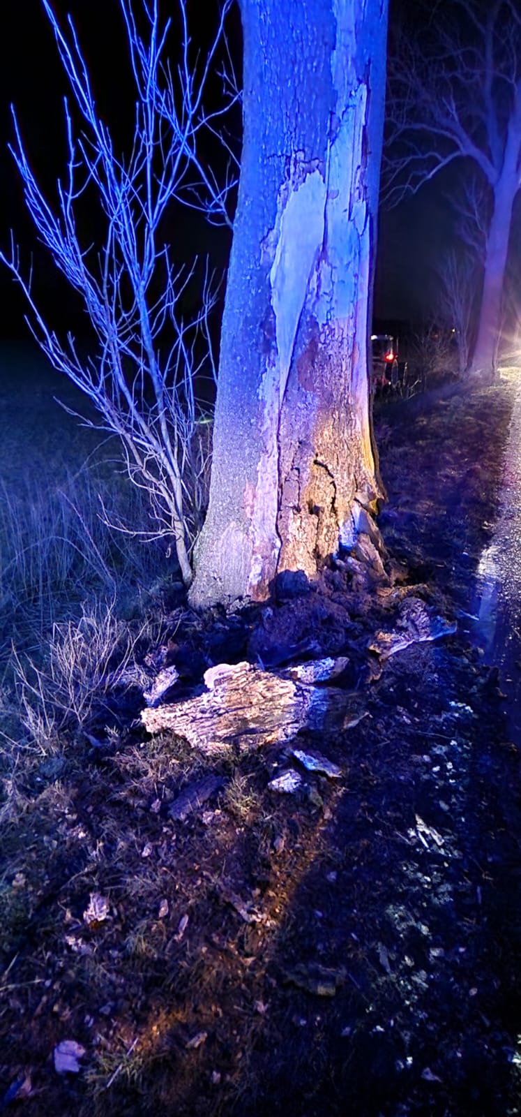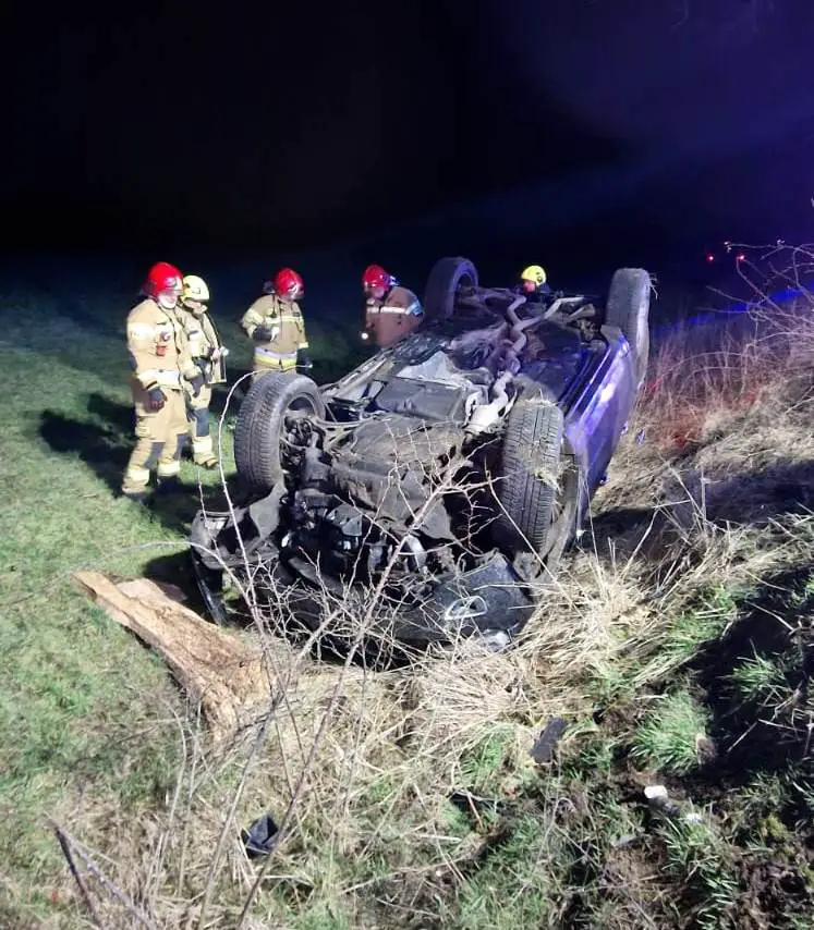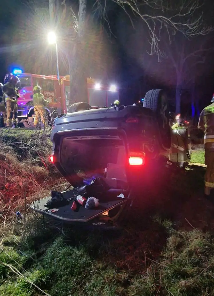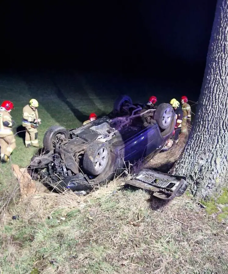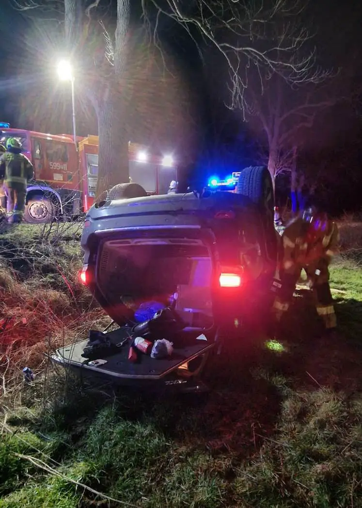 Po dojeździe na miejsce zdarzenia strażacy zastali samochód osobowy, który uderzył w drzewo, a następnie dachował. Kierujący opuścił pojazd przed przybyciem straży pożarnej i oddalił się z miejsca zdarzenia. Pojazd znajdowała się na dachu na pobliskim polu.