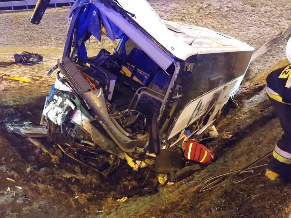 Autokar rozerwał bariery energochłonne i wpadł do rowu. Autokar roztrzaskał się uderzają w skarpę.