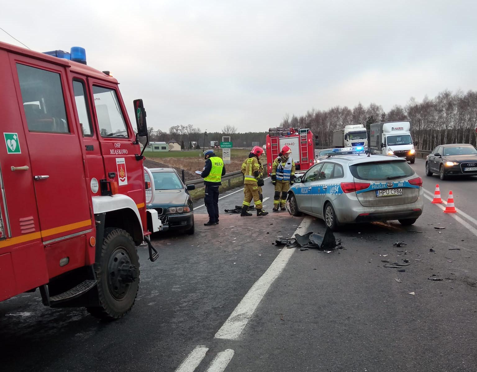 Do zderzenia bmw i radiowozu doszło z samego rana. Na miejsce dojechały wozy strażaków zawodowych ze Środy Wielkopolskiej oraz jednostki OSP Miąskowo i Krzykosy. Dojechała też policja oraz karetka pogotowia ratunkowego.