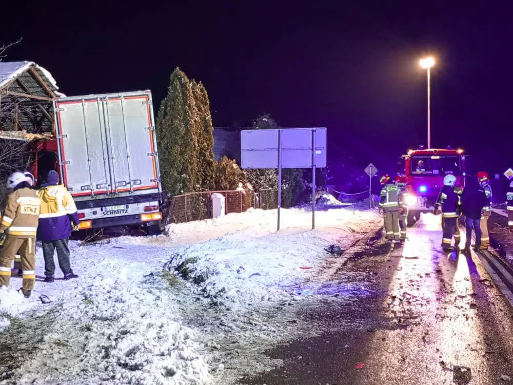 Dwie osoby zostały ranne i trafiły do szpitala po zderzeniu auta osobowego i ciężarówki, do którego doszło w Zaleszanach w woj. podkarpackim. Pojazd ciężarowy dodatkowo uderzył jeszcze w dom.