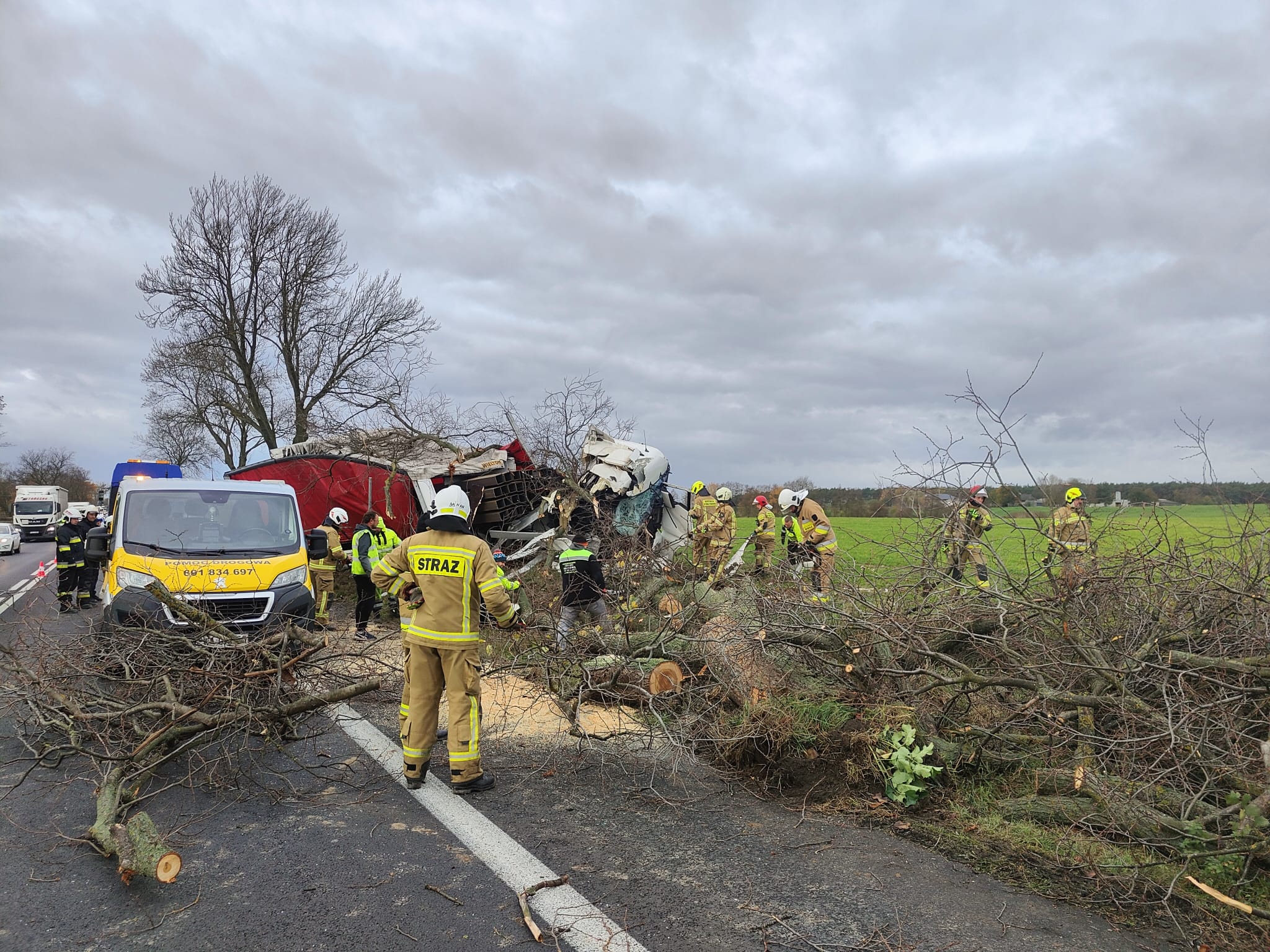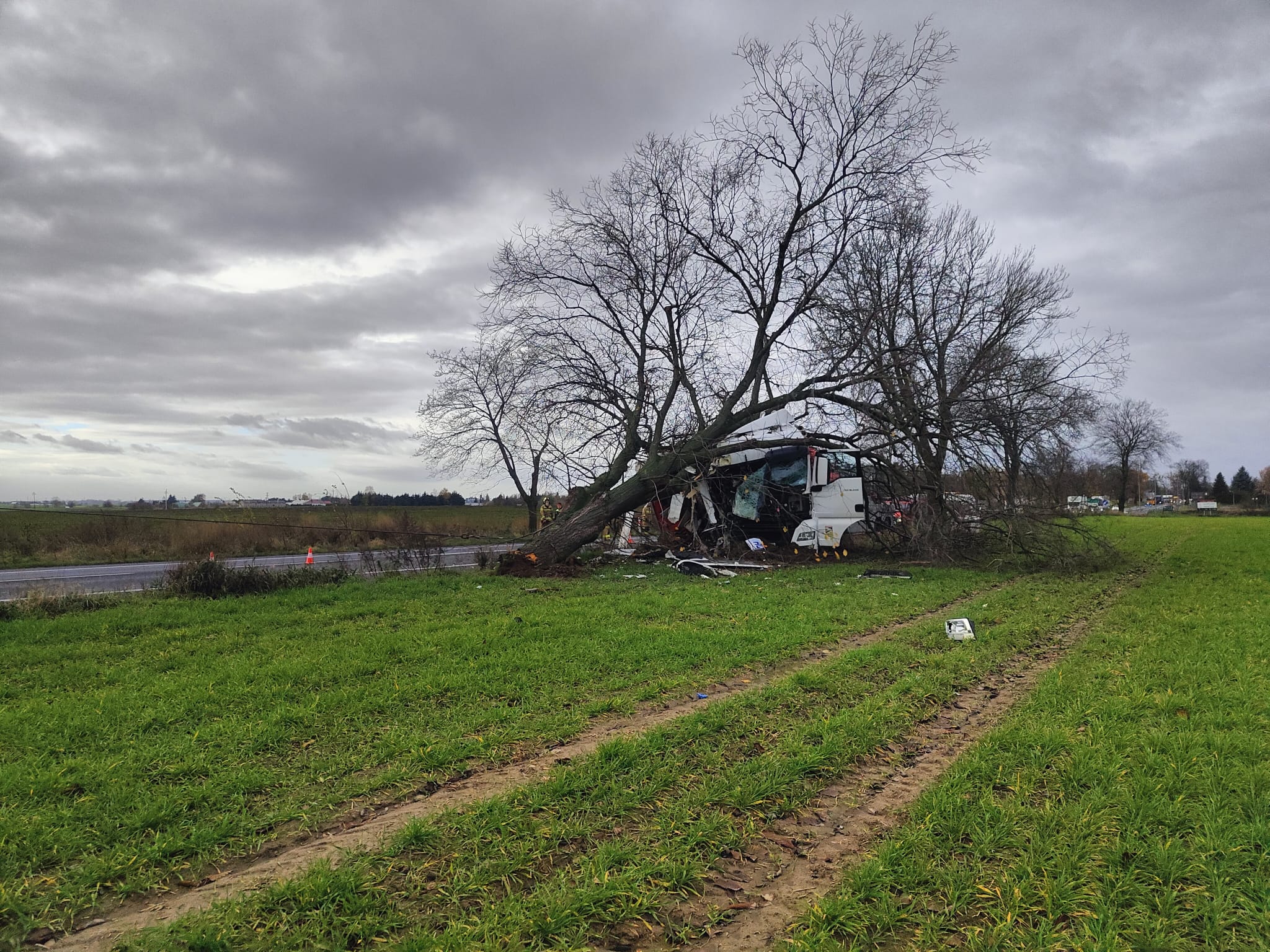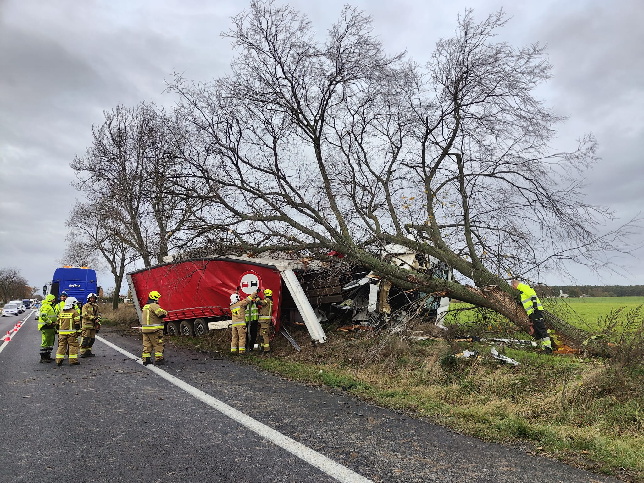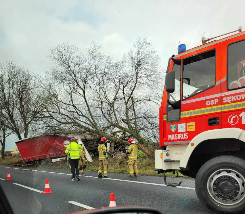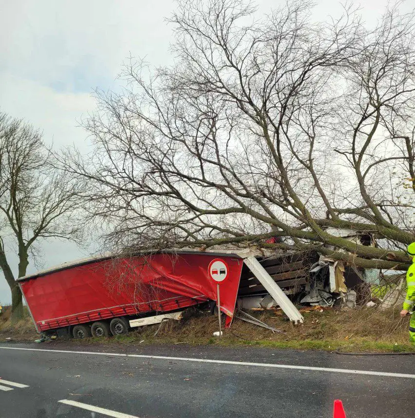 Po dojeździe na miejsce zdarzenia strażacy zastali samochód ciężarowy MAN, który przodem uderzył w drzewo. Kierujący opuścił pojazd przed przybyciem SP i znajdował się w pobliżu. Droga krajowa nr 92 była zablokowana. Pojazd znajdował się poza drogą.