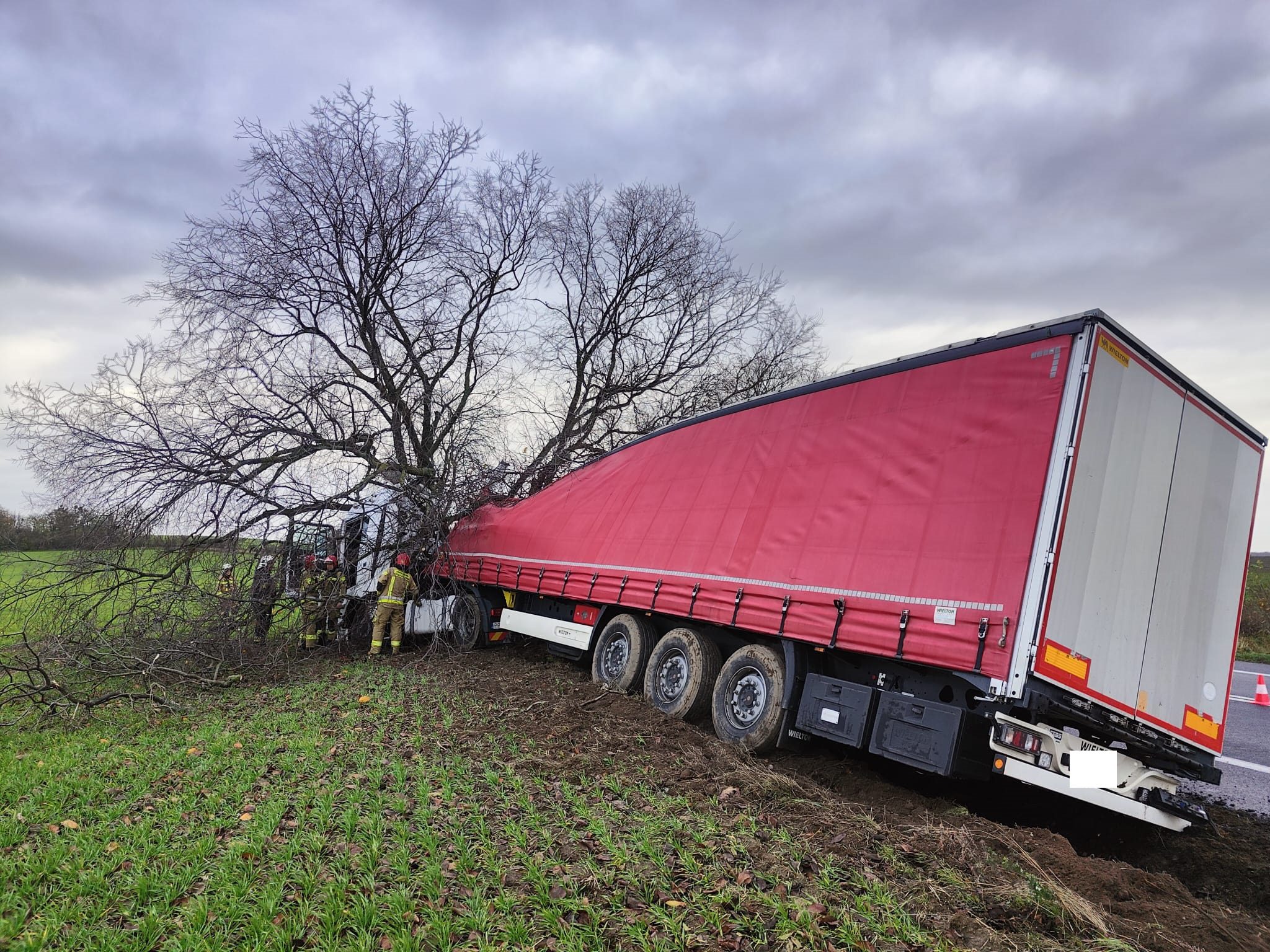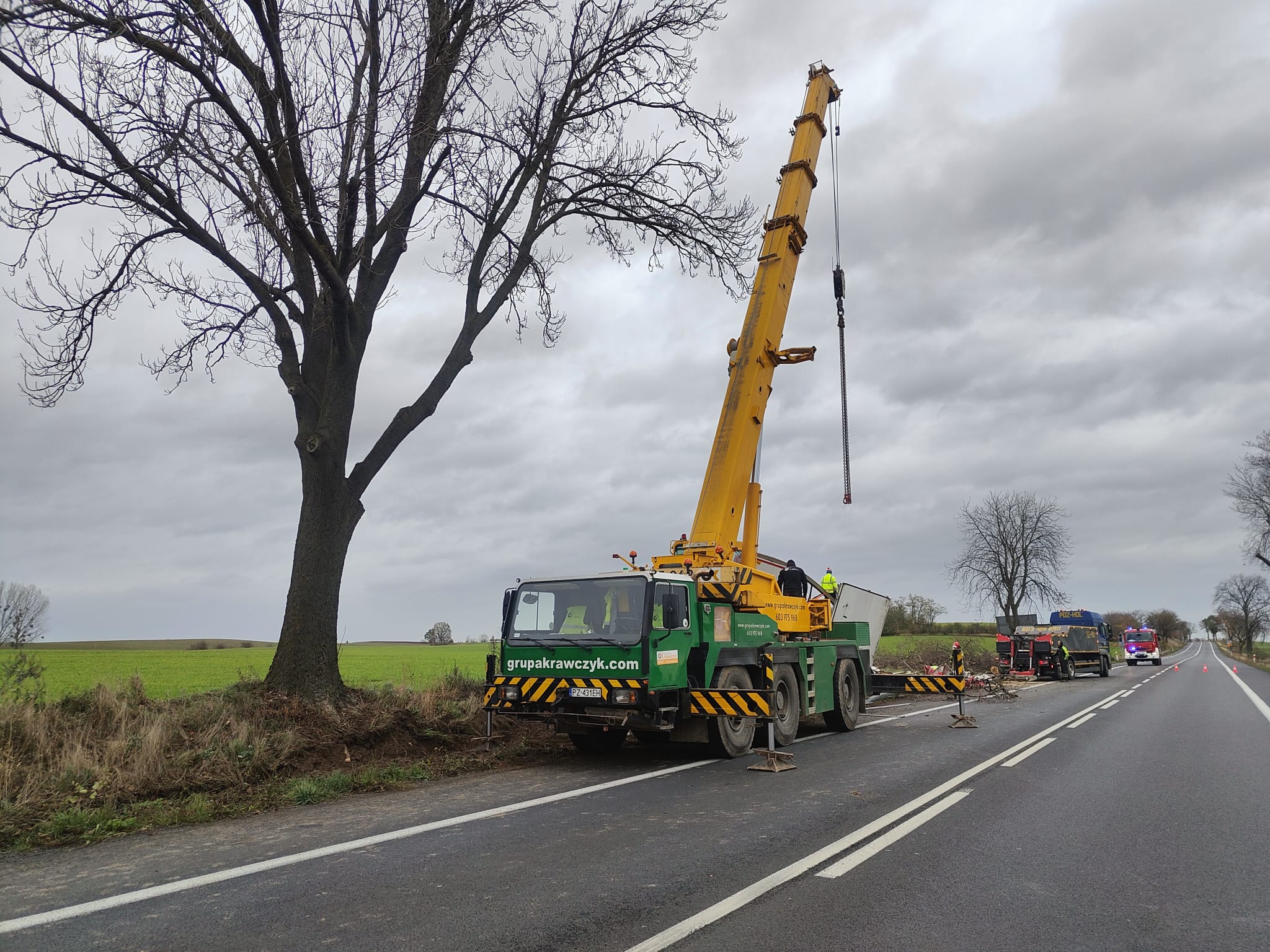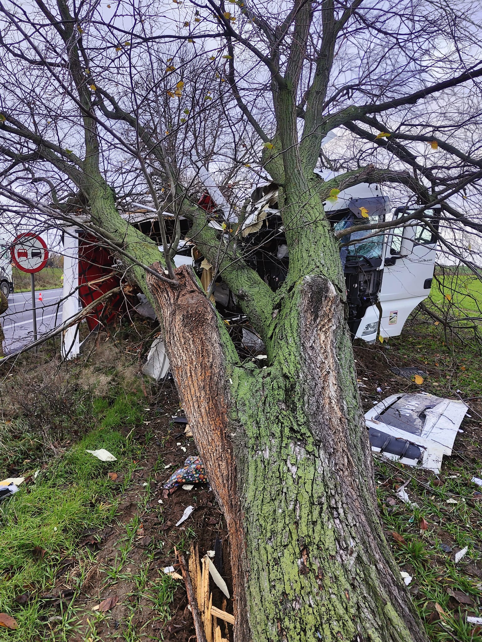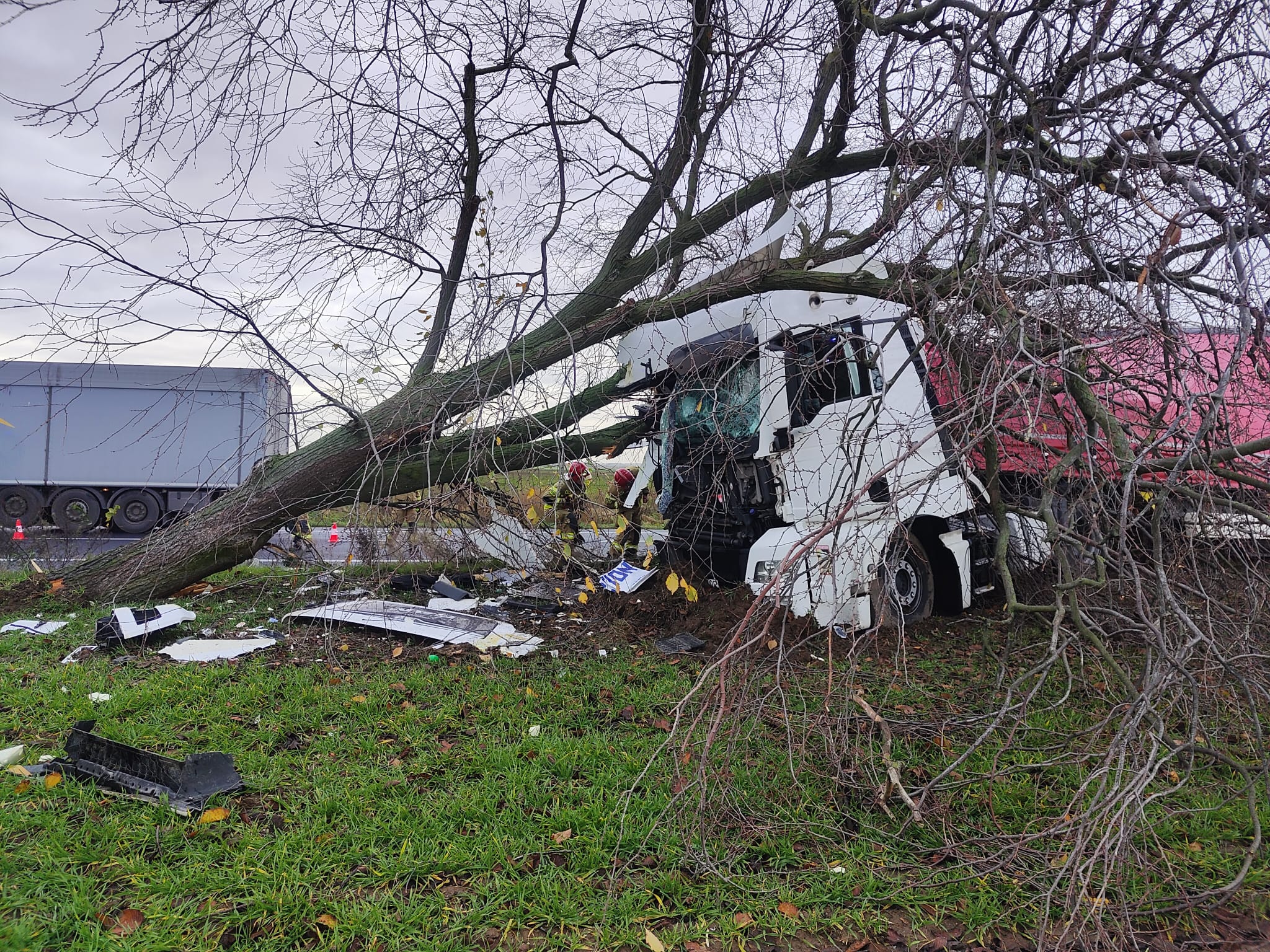 Po dojeździe na miejsce zdarzenia strażacy zastali samochód ciężarowy MAN, który przodem uderzył w drzewo. Kierujący opuścił pojazd przed przybyciem SP i znajdował się w pobliżu. Droga krajowa nr 92 była zablokowana. Pojazd znajdował się poza drogą.