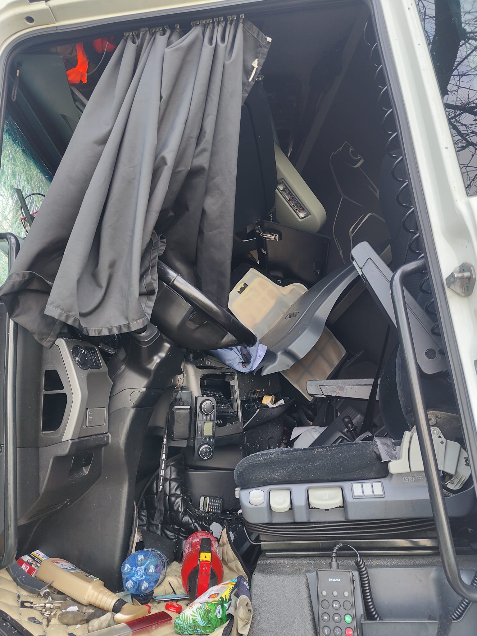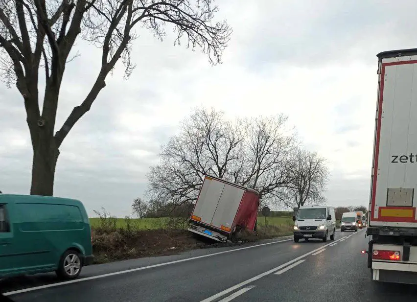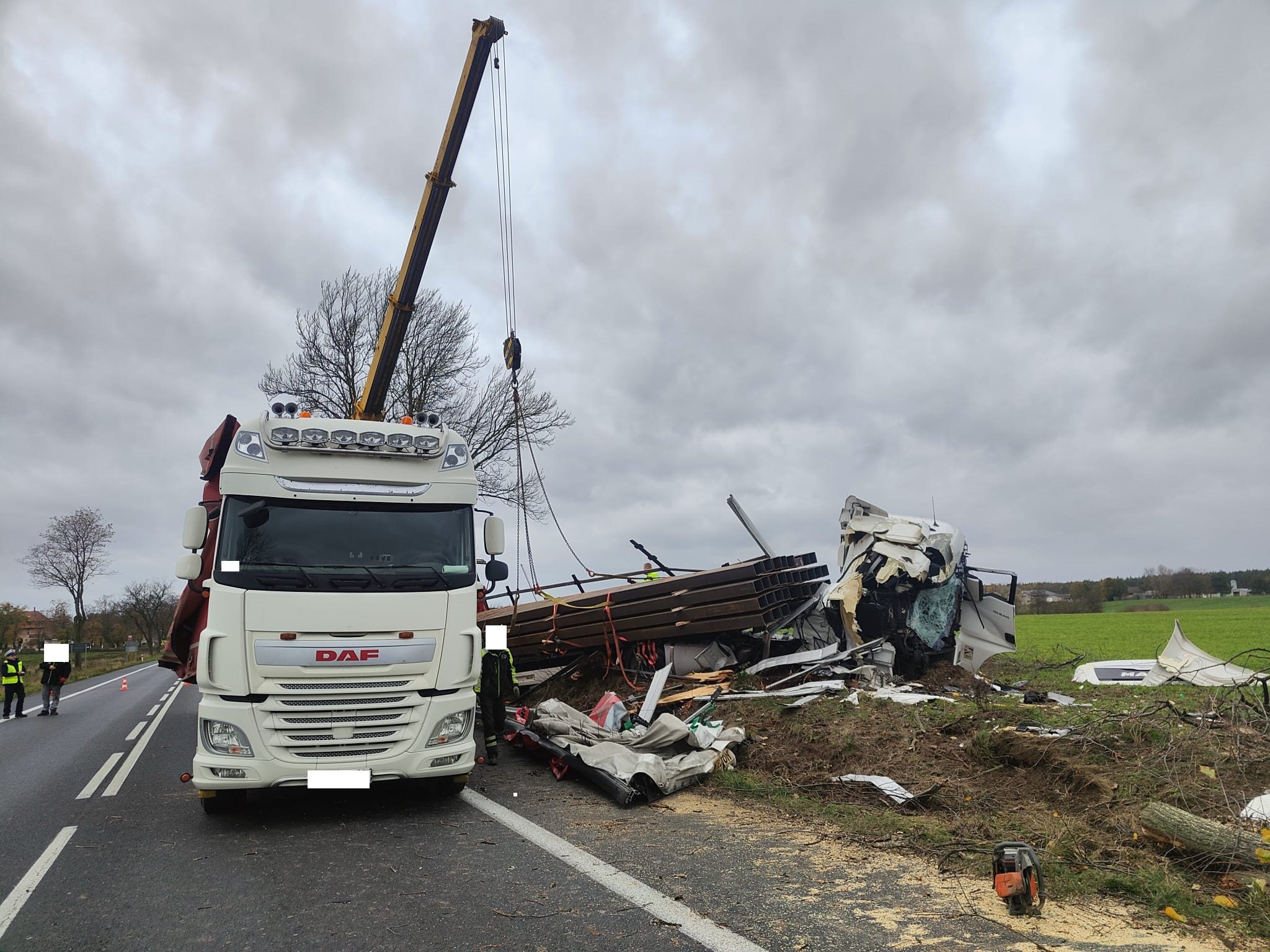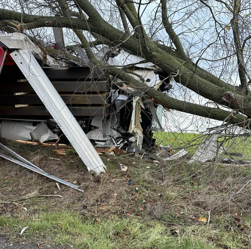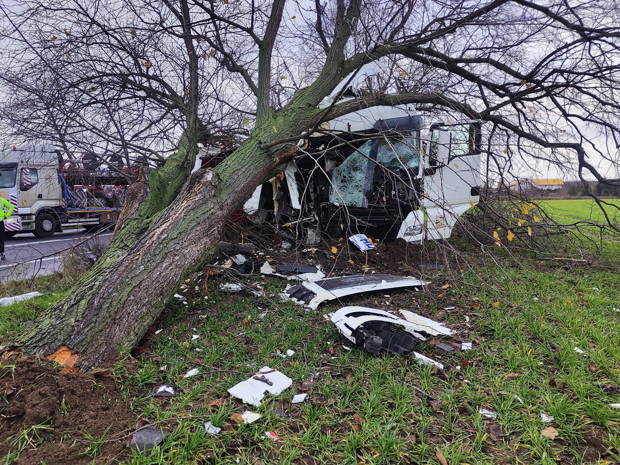Po dojeździe na miejsce zdarzenia strażacy zastali samochód ciężarowy MAN, który przodem uderzył w drzewo. Kierujący opuścił pojazd przed przybyciem SP i znajdował się w pobliżu. Droga krajowa nr 92 była zablokowana. Pojazd znajdował się poza drogą.