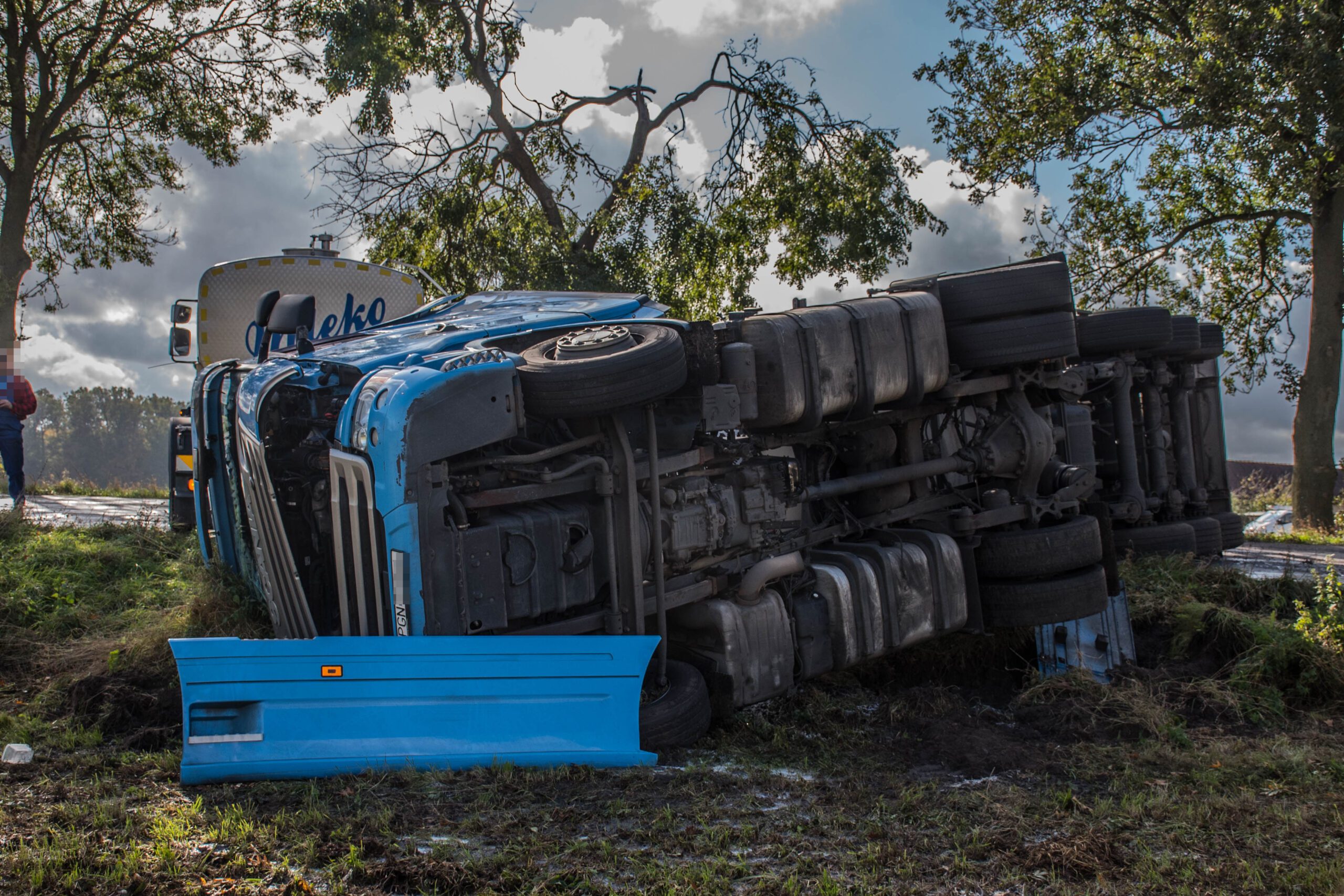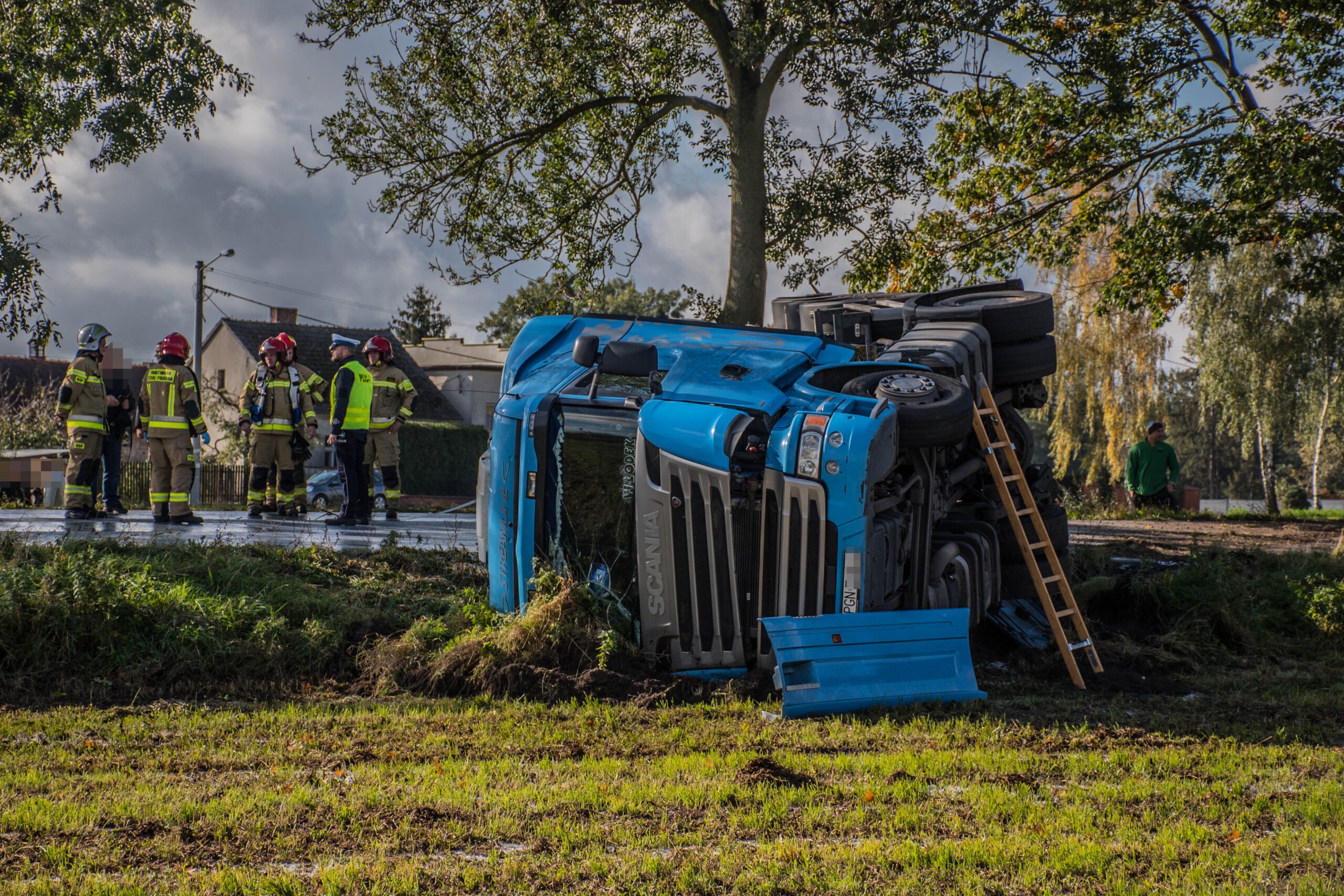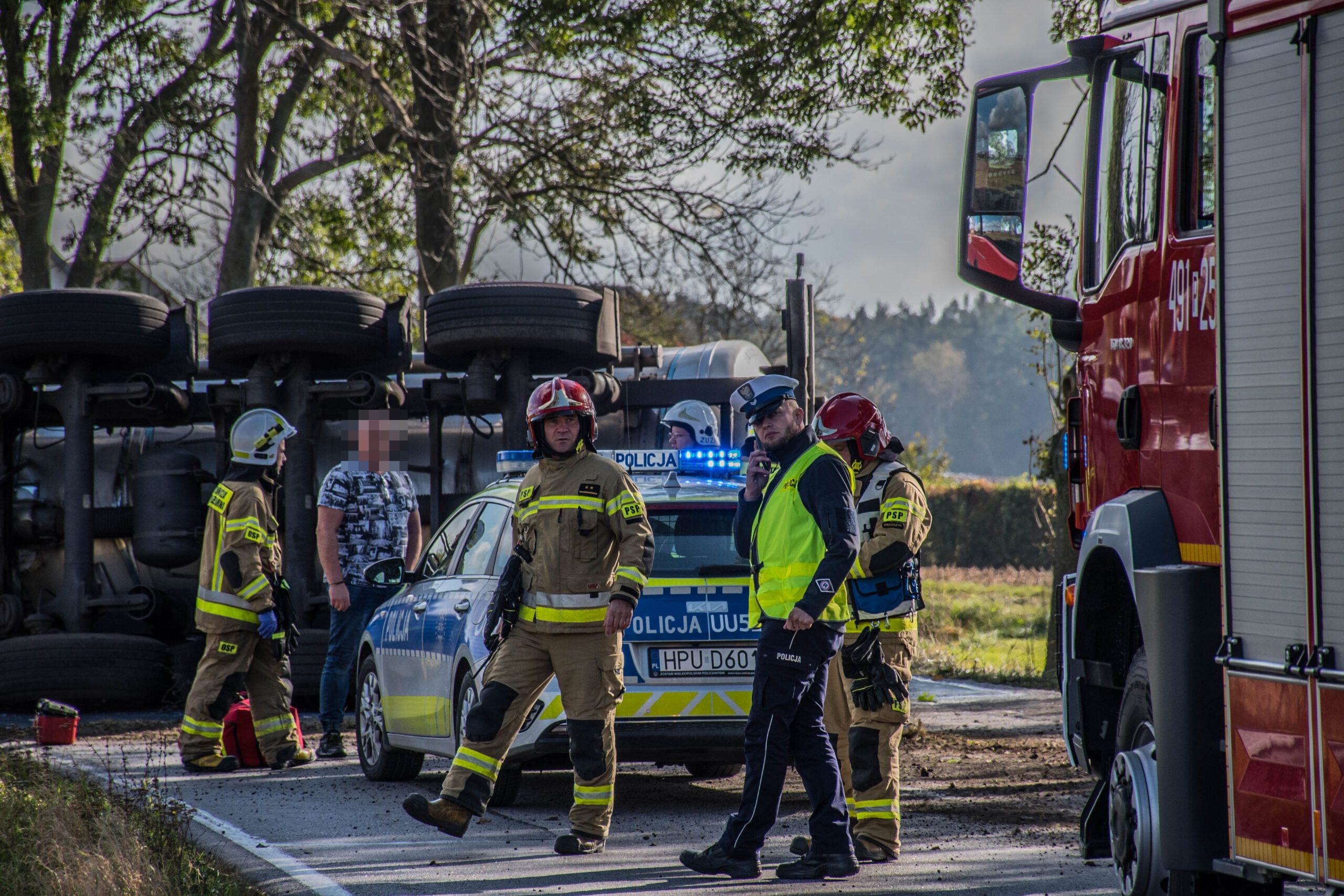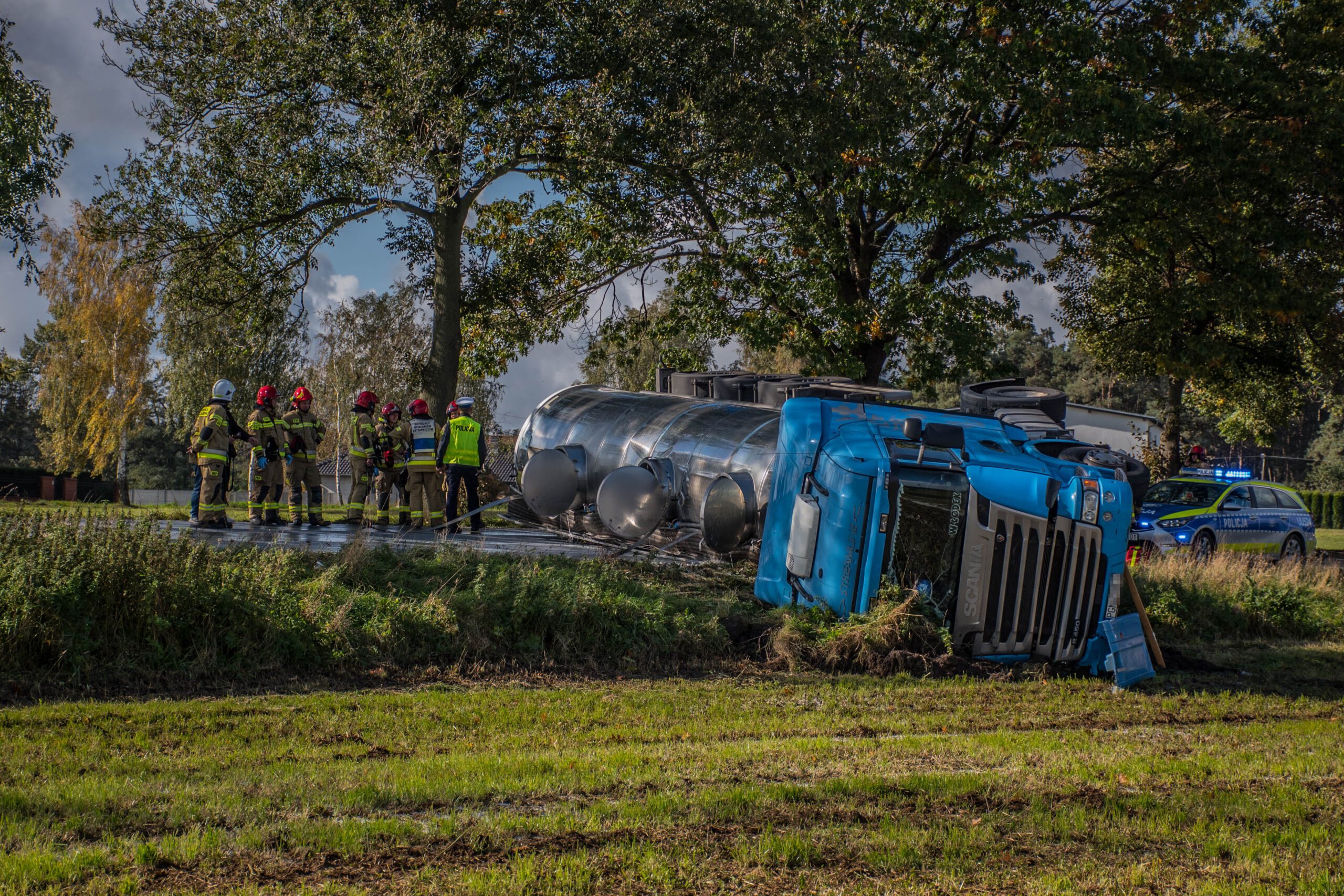 Z uwagi na zgłaszane dolegliwości bólowe w późniejszej fazie działań mężczyźnie udzielono kwalifikowanej pierwszej pomocy adekwatnej do poniesionych obrażeń. Po przybyciu służb medycznych uczestnik zdarzenia został przekazany pod opiekę kierownika zespołu, który po diagnostyce w karetce pogotowia nie stwierdził podstaw do hospitalizacji mężczyzny. W tym samym czasie odłączono akumulatory w ciągniku siodłowym oraz zweryfikowano wycieki płynów eksploatacyjnych, których nie stwierdzono. Z uwagi na długotrwałe zamknięcie odcinka drogi krajowej obecni na miejscu funkcjonariusze Policji wyznaczyli objazdy. Właściciel firmy transportowej zorganizował cysternę zastępczą do której przepompowano pozostałą część mleka oraz specjalistyczną pomoc drogową, która rozpoczęła stawianie zestawu na koła.