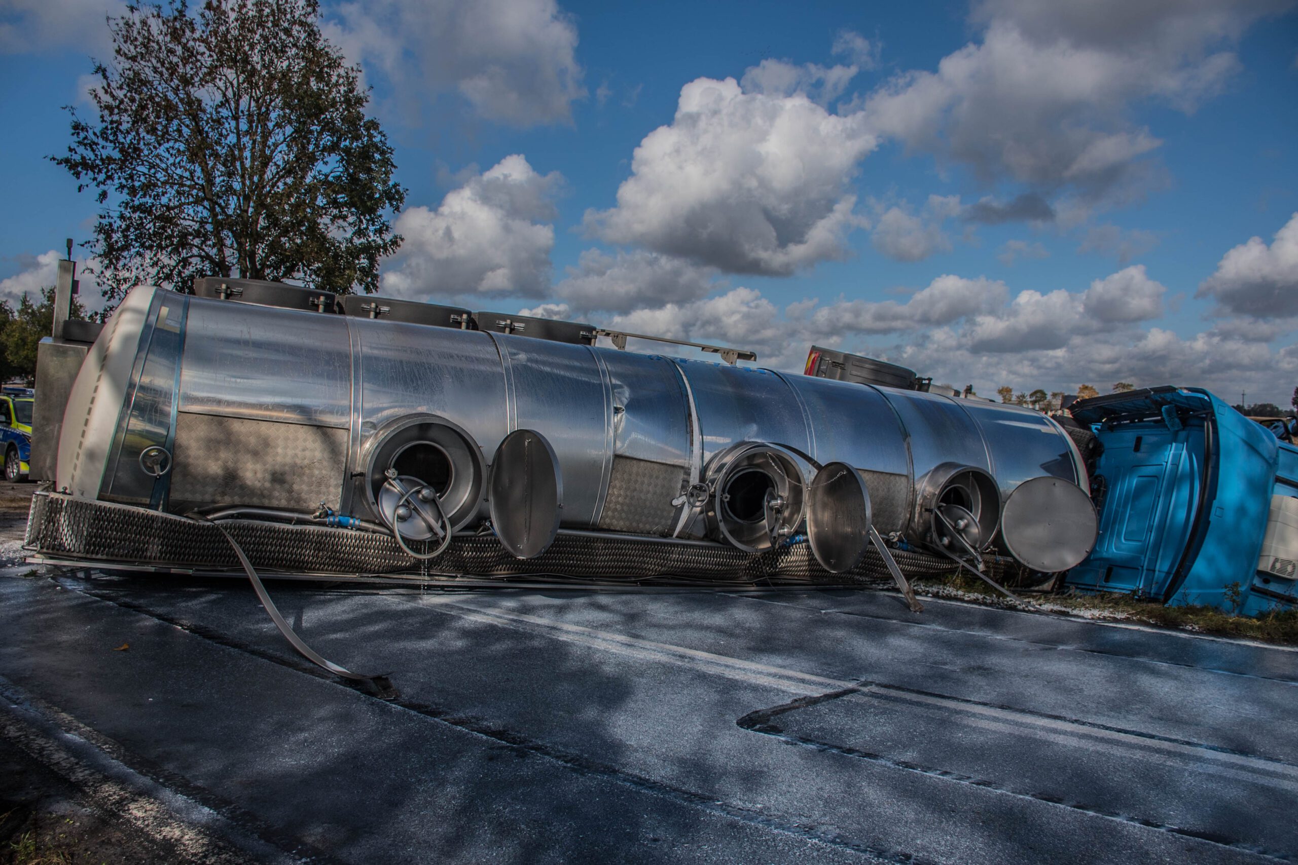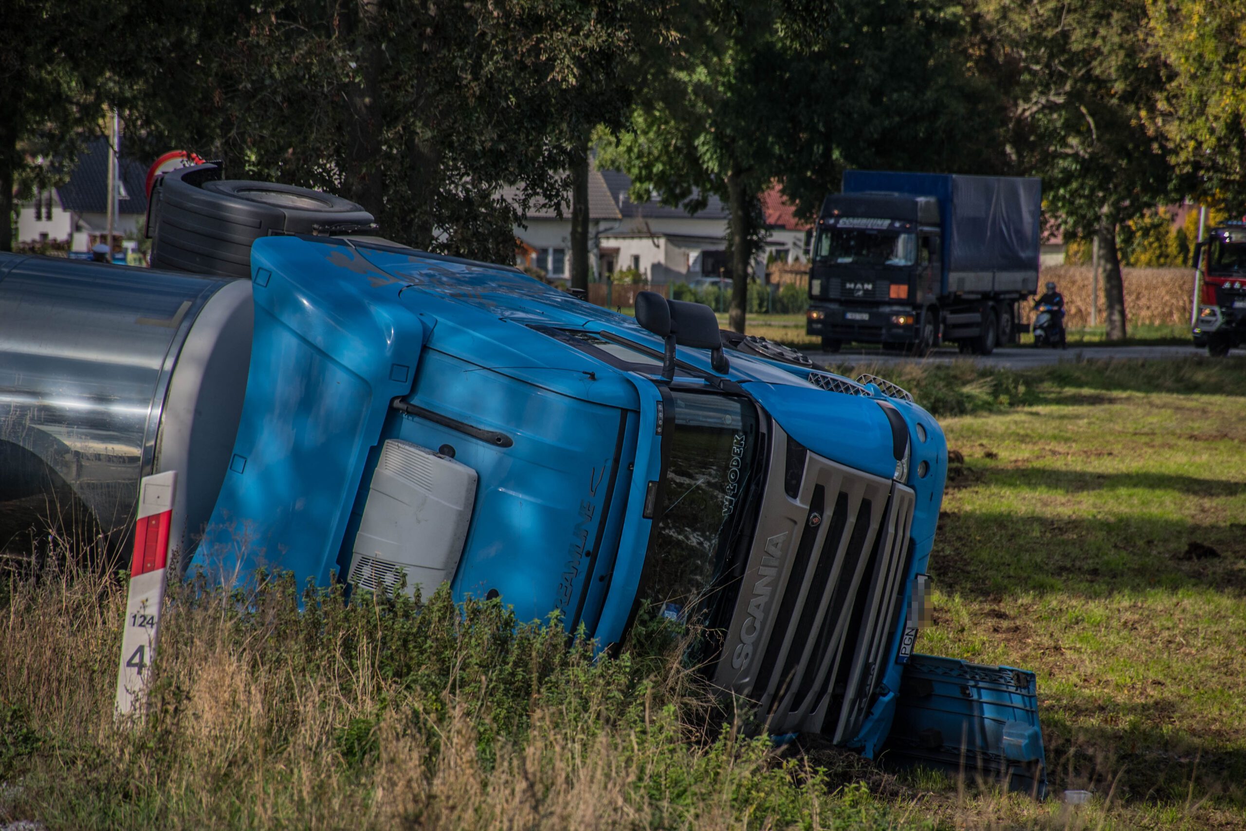 We wtorek, 15 października 2024 roku na drodze krajowej numer 36 w miejscowości Smoszew doszło do wypadku z udziałem cysterny przewożącej mleko. Zestaw ciężarowy przewrócił się na bok,blokując ruch pojazdów w obu kierunkach. Niestety w wyniku zdarzenia doszło do uszkodzenia zbiornika i nastąpił niekontrolowany wyciek przewożonego surowca.
