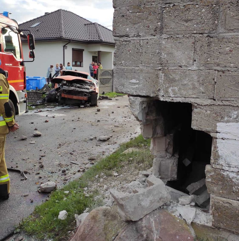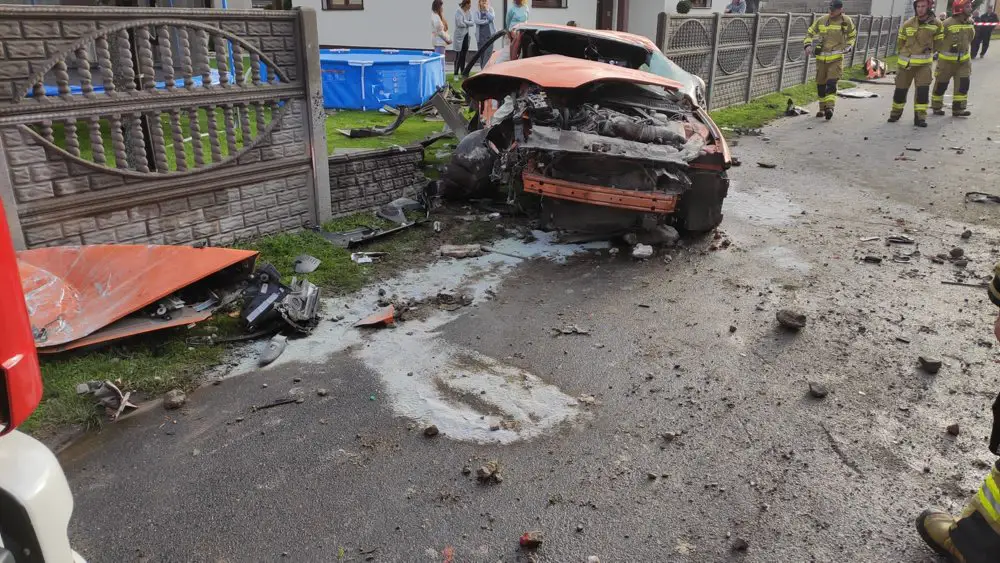 Po dojeździe na miejsce okazało się, że kierujący fordem mustangiem z duża siłą uderzył w przydrożny budynek gospodarczy. Odbił się od muru i trzasnął w betonowe ogrodzenie posesji.
