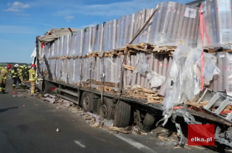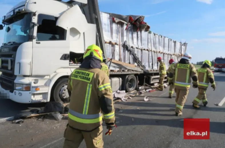 Po przyjeździe na miejsce zastaliśmy bardzo groźnie wyglądającą sytuację. Oba pasy były zasypane materiałami przewożonymi na jednej z ciężarówek. Okazało się, że jeden z pojazdów uległ awarii i znajdował się na pasie bezpieczeństwa. Jadąca prawym pasem scania, zahaczyła o tego tira. 50-letni kierowca nie miał możliwości wymanewrowania, gdyż w tym samym czasie był wyprzedzany lewym pasem przez inną ciężarówkę – mówi w rozmowie z Radio Elka Leszno asp. Piotr Mulczyński z KM PSP w Lesznie
