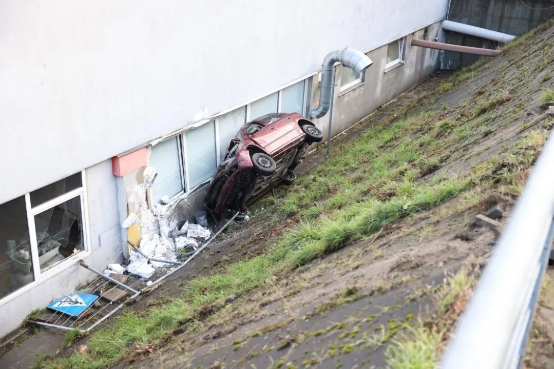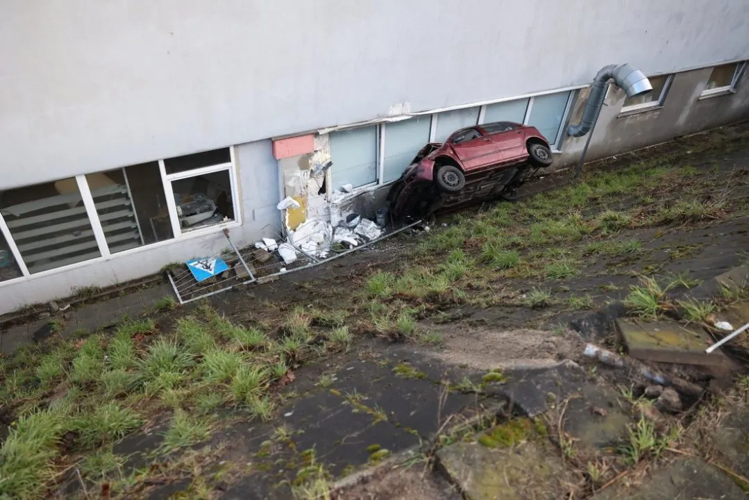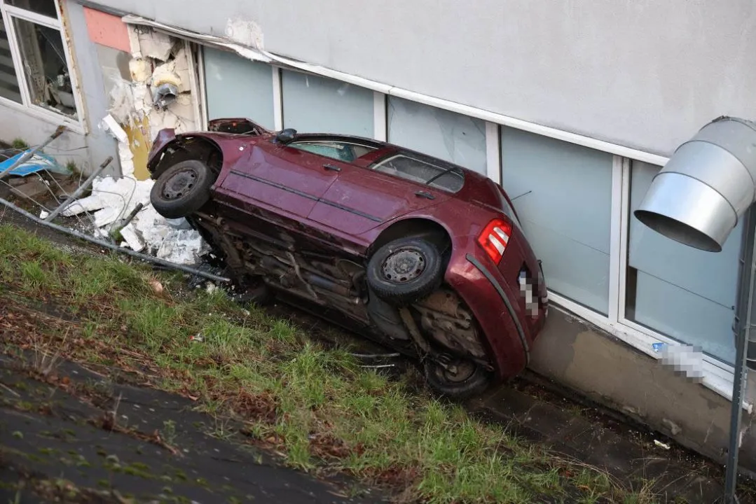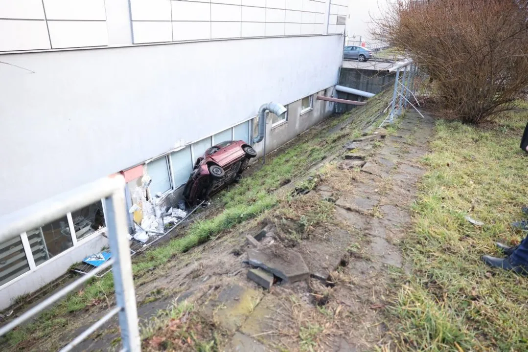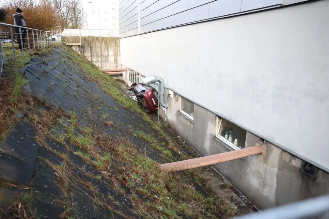 Samochód wypadł z drogi, ściął znaki drogowe, przejechał przez chodnik, rozbił barierki i spadł z wysokiej skarpy. Skoda z dużą siłą uderzyła w ścianę garażu podziemnego Carrefour od strony myjni samochodowej i lakierni.