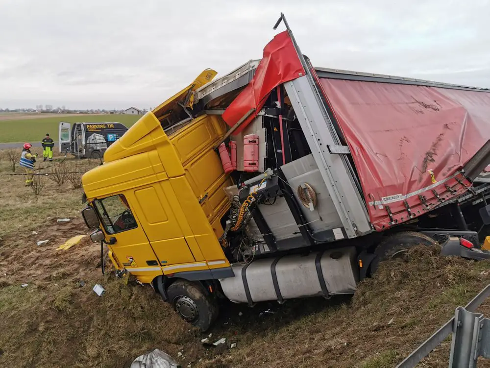 Kierujący ciężarówką uderzył w ty stojącego na pasie awaryjnym ciężarowego iveco. Siła uderzenia była bardzo duża. Obie ciężarówki wypadły z drogi i przewróciły się.