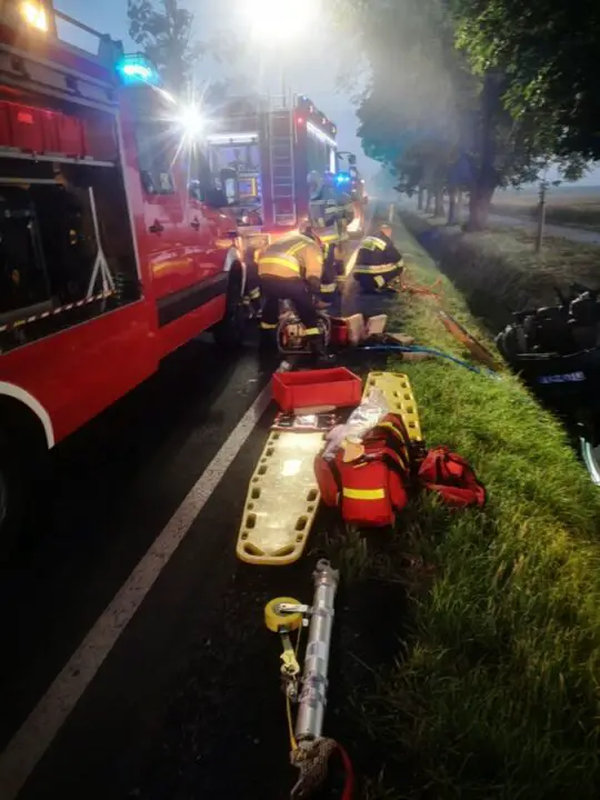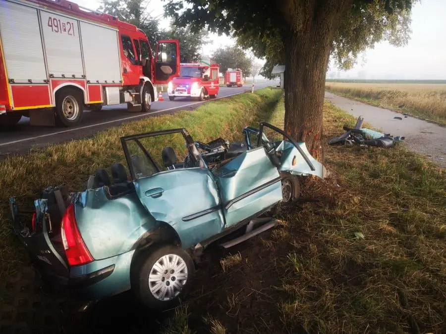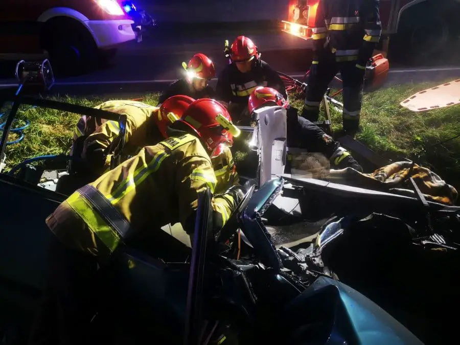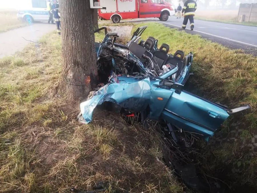 Dyżurny Operacyjny Powiatu do zdarzenia zadysponował dwa zastępy z Jednostki Ratowniczo – Gaśniczej w Krotoszynie oraz jednostki OSP Krotoszyn i OSP Lutogniew. Po dojeździe na miejsce zdarzenia w wyniku przeprowadzonego rozpoznania ustalono, że w rozbitym samochodzie osobowym, który uderzył w drzewo i zatrzymał się w przydrożnym rowie znajduje się nieprzytomny kierowca. Silna deformacja bryły samochodu uniemożliwia ewakuację poszkodowanego bez użycia narzędzi hydraulicznych. W chwili przybycia straży pożarnej na miejscu wypadku nie było innych służb ratunkowych. Strażacy po zabezpieczeniu i oświetleniu terenu działań przystąpili do cięcia i rozginania karoserii pojazdu celem wykonania dostępu do osoby poszkodowanej. Decyzją Kierującego Działaniem Ratowniczym do wnętrza rozbitego samochodu wprowadzono ratownika, który na bieżąco kontrolował stan mężczyzny udzielając pomocy medycznej adekwatnej do możliwości i stanu poszkodowanego. Presja czasu była ogromna, gdyż kierowca wymagał pilnej hospitalizacji z uwagi na poniesione obrażenia. Wykorzystane techniki ratownictwa drogowego z użyciem kilku zestawów hydraulicznych przyniosły zamierzony efekt i osoba poszkodowana została ewakuowana na noszach typu deska do karetki pogotowia. Decyzją Kierownika Zespołu Ratownictwa Medycznego uczestnika zdarzenia przetransportowano do Szpitalnego Oddziału Ratunkowego. W dalszej części działań Jednostki Ochrony Przeciwpożarowej wspomagały czynności realizowane przez funkcjonariuszy Policji w zakresie oświetlenia oraz zabezpieczenia miejsca wypadku. Interwencja w której uczestniczyły 4 zastępy i 17 strażaków trwała łącznie 02 godziny i 43 minuty.