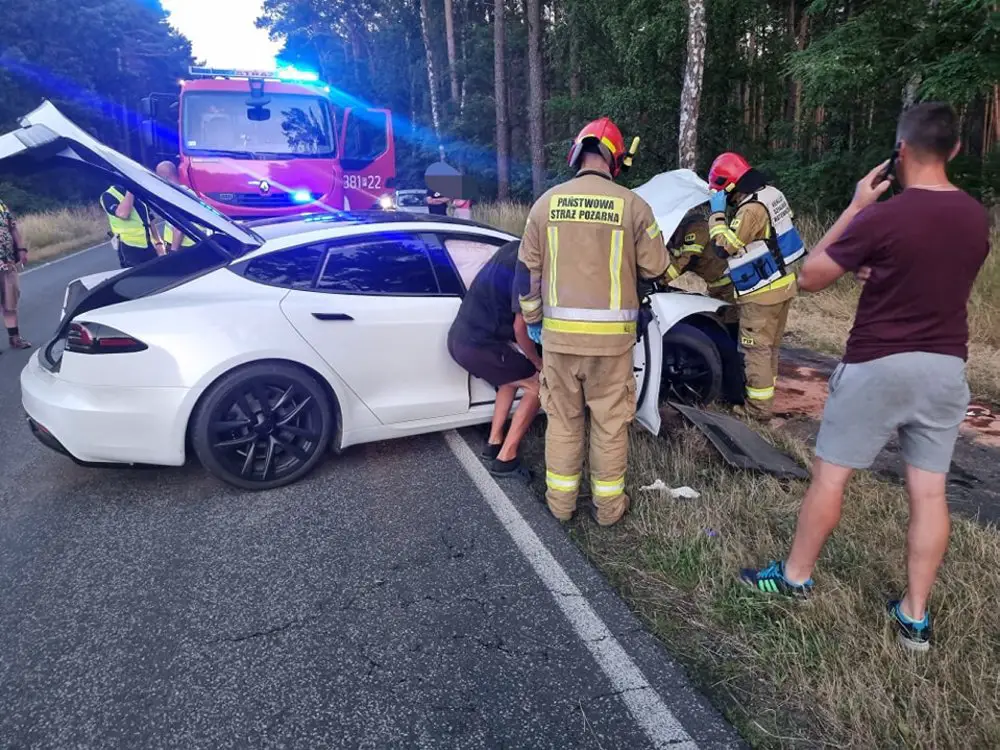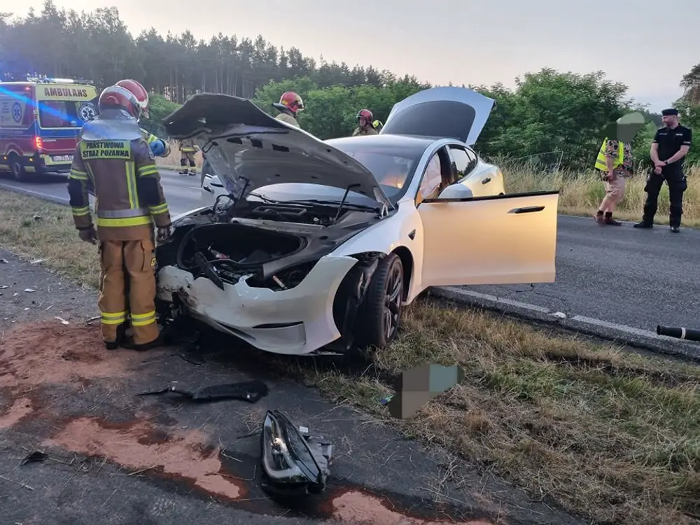 Podczas wyprzedzania doszło do czołowo-bocznego zderzenia z samochodem marki Tesla.