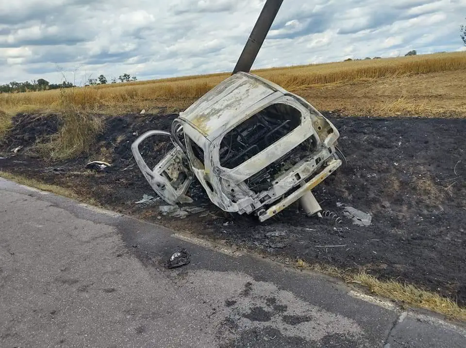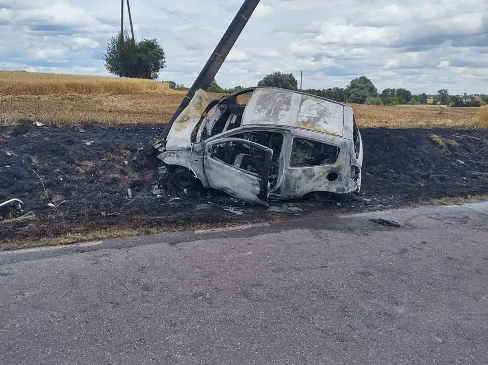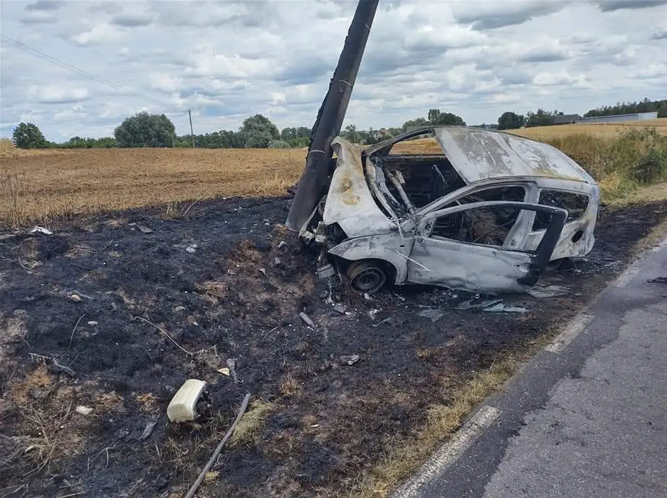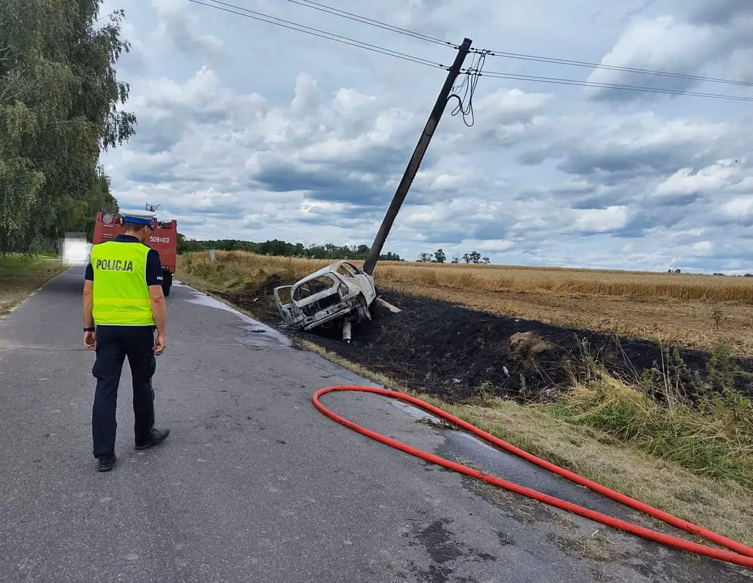 Kierująca pojazdem marki Citroen, 36-letnia mieszkanka powiatu międzychodzkiego z nieustalonych przyczyn zjechała z drogi i uderzyła w słup energetyczny. Z kobietą podróżowało 5-letnie dziecko. Osoby zostały przewiezione do szpitala. Auto oraz część pobocza i pola uległy spaleniu.