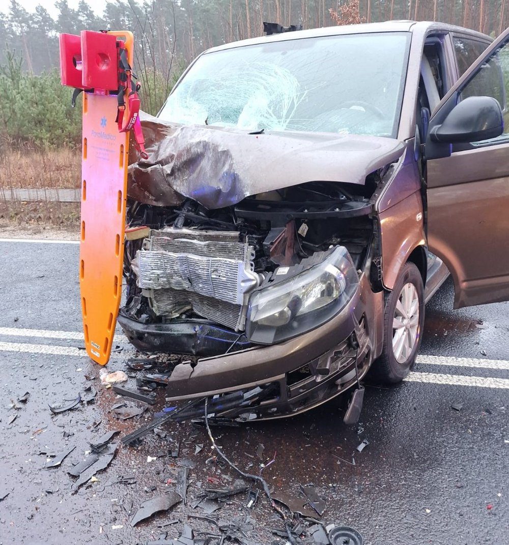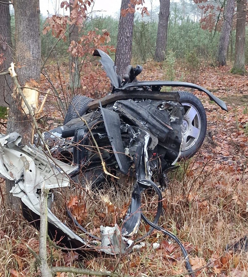 Do poważnego wypadku doszło w Cyganówce. 18-letni kierowca volkswagenem zjechał na przeciwległy pas ruchu i zderzył się z busem, a następnie uderzył w drzewo. Volkswagen rozpadł się na dwa kawałki, z auta wypadł silnik.