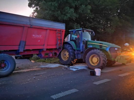 Po dojeździe na miejsce zdarzenia strażacy zastali ciągnik rolniczy z przyczepą, który zderzył się z samochodem osobowym (bus). Kierujący i pasażer opuścili pojazdy przed przybyciem SP i znajdowali się w pobliżu. Ciągnik rolniczy znajdował się na drodze (skrzyżowanie), natomiast samochód znajdował się w rowie.