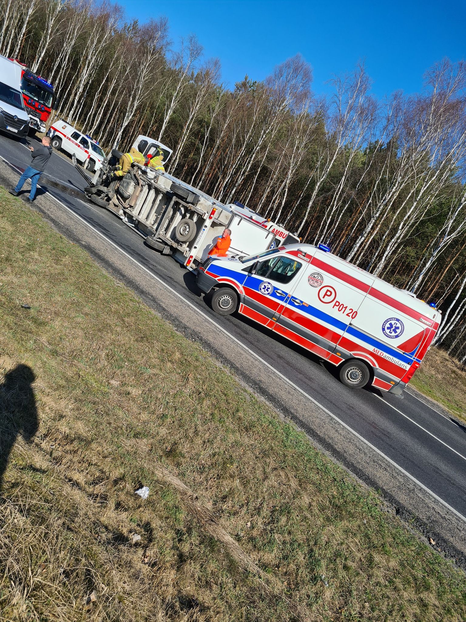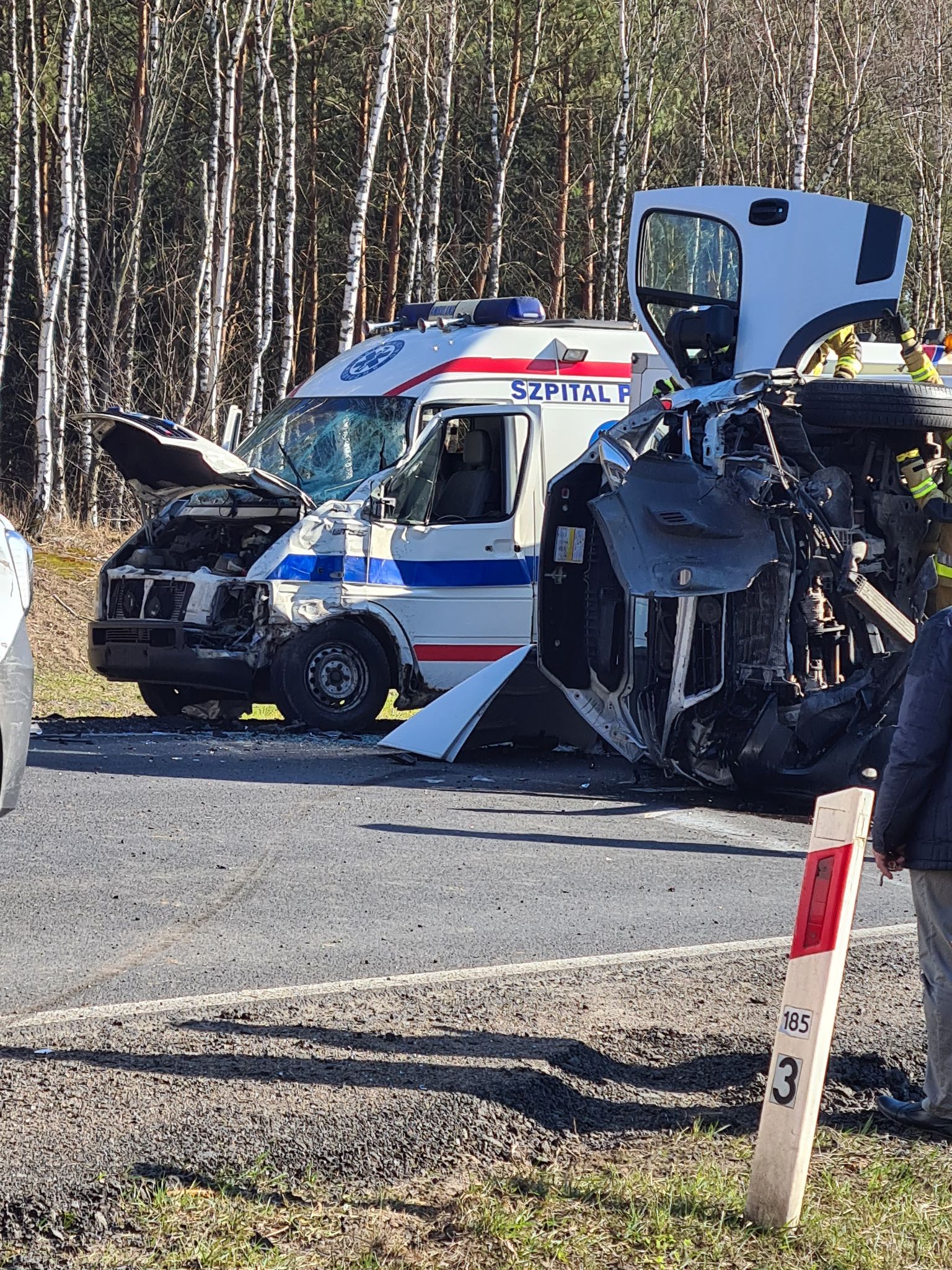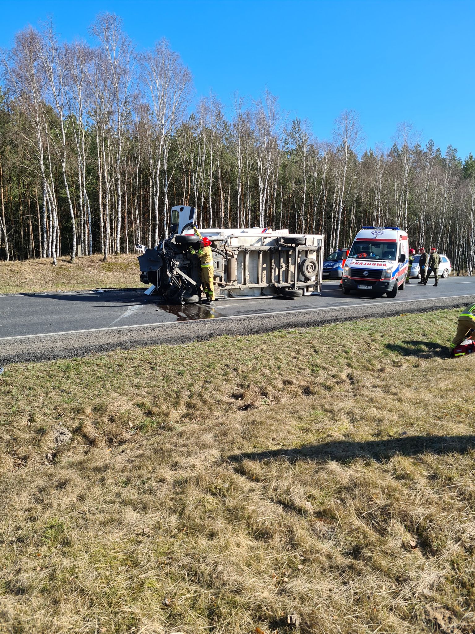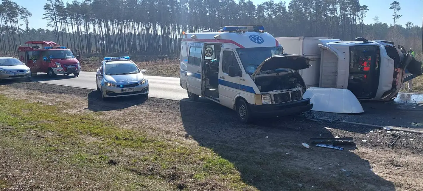 W wyniku zderzenia jeden z samochodów dostawczych przewrócił się na bok. Pojazdami podróżowało łącznie pięć osób, z czego poszkodowanych zostało 3 w tym ratownik medyczny oraz przewożony pacjent. Działania strażaków polegały na zabezpieczeniu terenu działań, udzieleniu kwalifikowanej pierwszej pomocy, postawieniu pojazdu na koła przy pomocy wyciągarek samochodowych oraz sorpcji rozlanych płynów eksploatacyjnych.