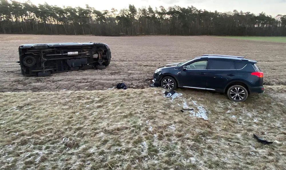 Bus i toyota po zderzeniu wypadły z drogi. Bus przewrócił się na bok. Na miejsce wypadku szybko dotarły służby ratunkowe.