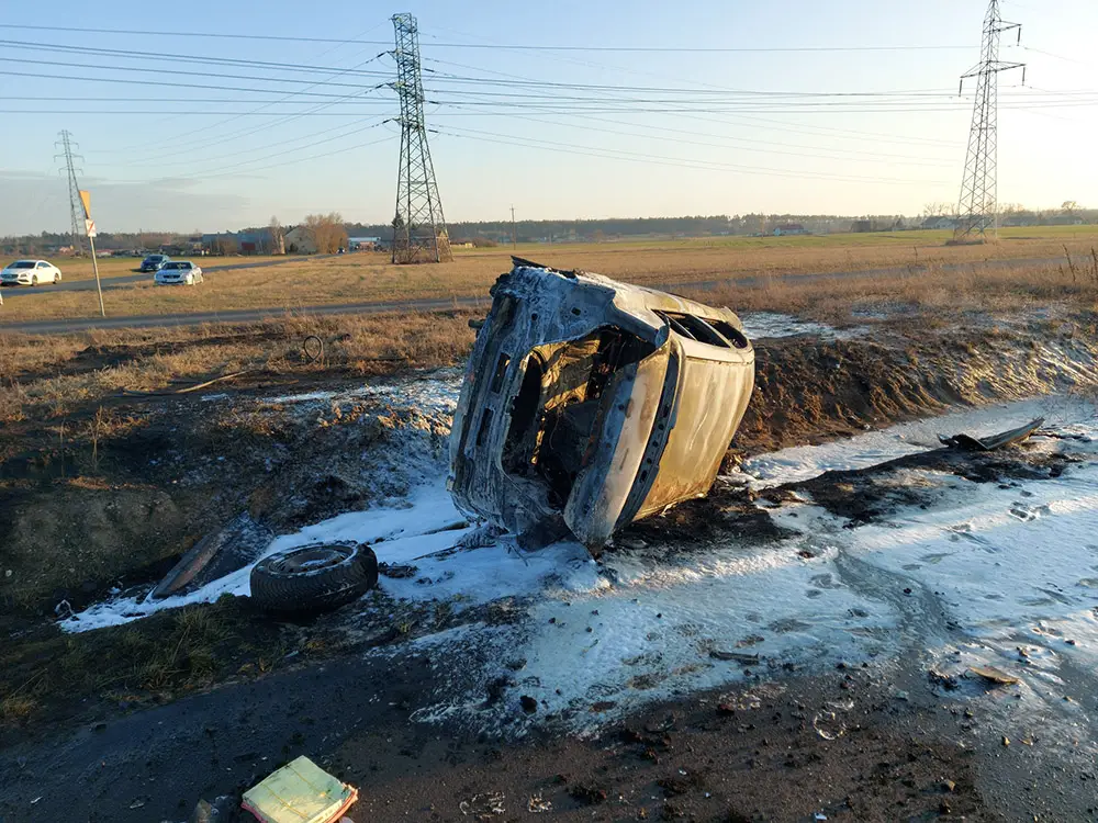 Samochodem osobowym jechały trzy osoby. Z chwilą przybycia pierwszych zastępów straży pożarnej wszyscy uczestniczy wypadku znajdowali się poza pojazdami. Samochód osobowy całkowicie spłonął.