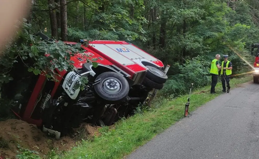 Strażak chcąc uniknąć czołowego zderzenia z hyundaiem zjechał z jezdni i wypadł z drogi. Strażacki wóz bojowy wywrócił się na skarpę przydrożnego rowu.