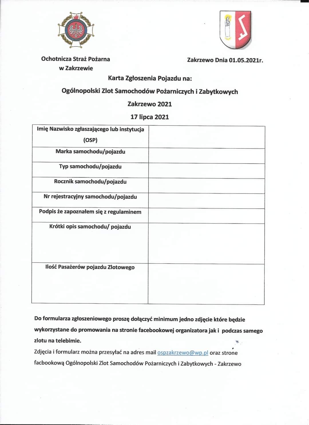 Druga forma to: wysyłamy za pomocą Facebooka (TUTAJ) zdjęcie Karty Zgłoszeń, którą należy pobrać z posta i wysłać wraz z zdjęciem pojazdu na adres email: ospzakrzewo@wp.pl lub na skrzynkę Facebookową Zlotu 😍🙂👨🚒