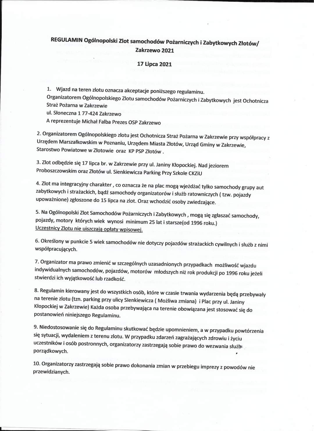 Dnia 17 lipca OSP Zakrzewo organizuje jubileuszowy piąty Ogólnopolski Zlot samochodów Pożarniczych i Zabytkowych Zakrzewo 2021. Zlot jak dotychczas rozpoczyna się w Złotowie potem najdłuższa parada do Zakrzewa. A tam wiele atrakcji i wieczorne koncerty. Zapraszamy do zapisów samochody Pożarnicze i prywatne jak również inne pojazdy z duszą. Więcej szczegółów niebawem do zobaczenia 17 lipca – zaprasza jeden z organizatorów zlotu Michał Falba