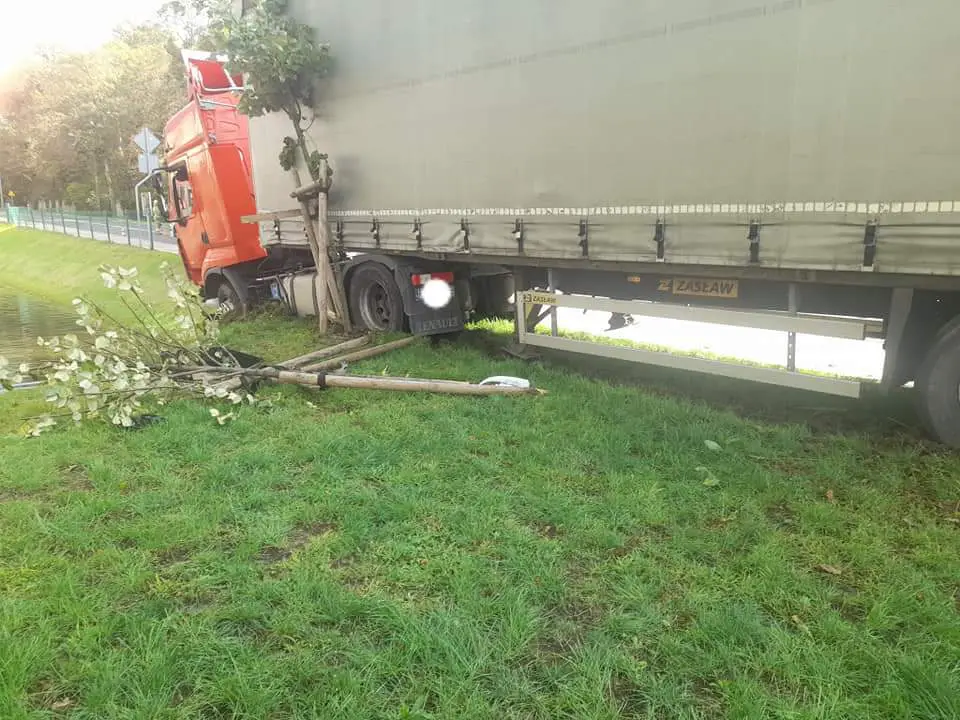Do zdarzenia doszło w poniedziałek, 12 września, około godziny 15.30. Według ustaleń policji 54-letni mieszkaniec powiatu kaliskiego, kierujący ciągnikiem siodłowym, jadący drogą wojewódzką nr 310 przejeżdżając przez Czempiń przysnął za kierownicą i zjechał na pas zieleni, a jazdę zakończył częściowo w stawie.