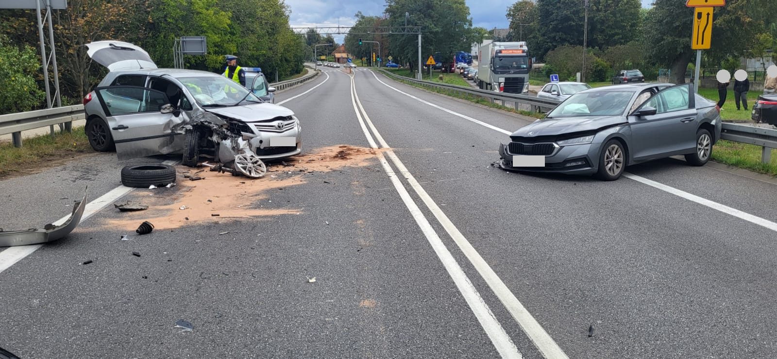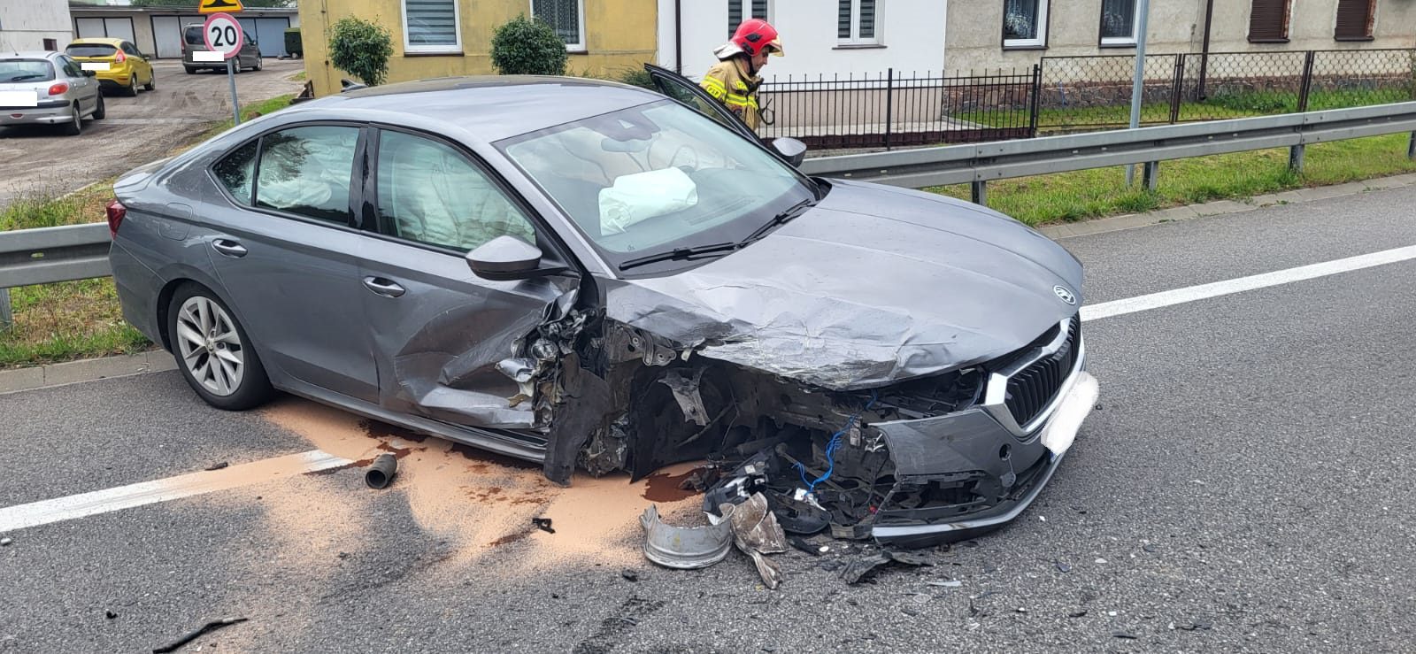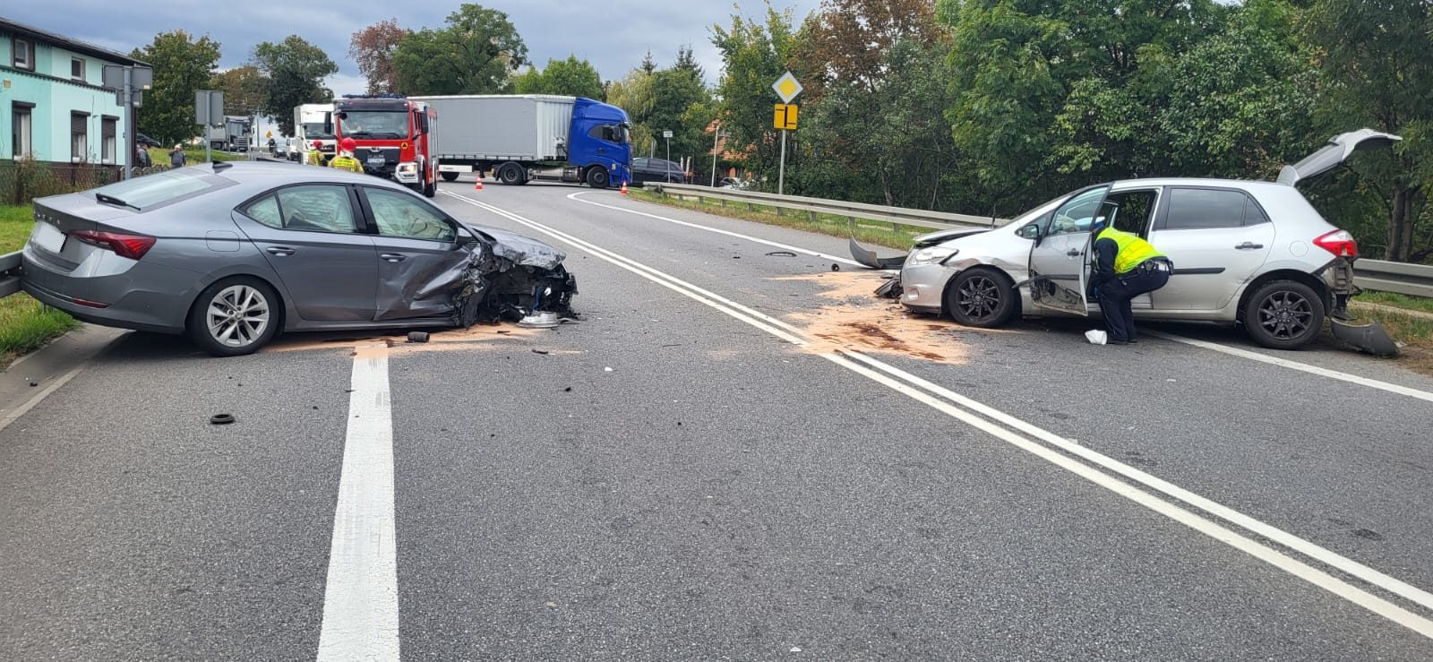 Po dojeździe na miejsce zdarzenia strażacy zastali dwa samochody osobowe, które zderzyły się ze sobą. Kierujący i pasażerowie opuścili pojazdy przed przybyciem SP i znajdowali się w pobliżu pod opieką ratowników medycznych. Pojazdy znajdowały się na pasach ruchu, droga była zablokowana w obu kierunkach.