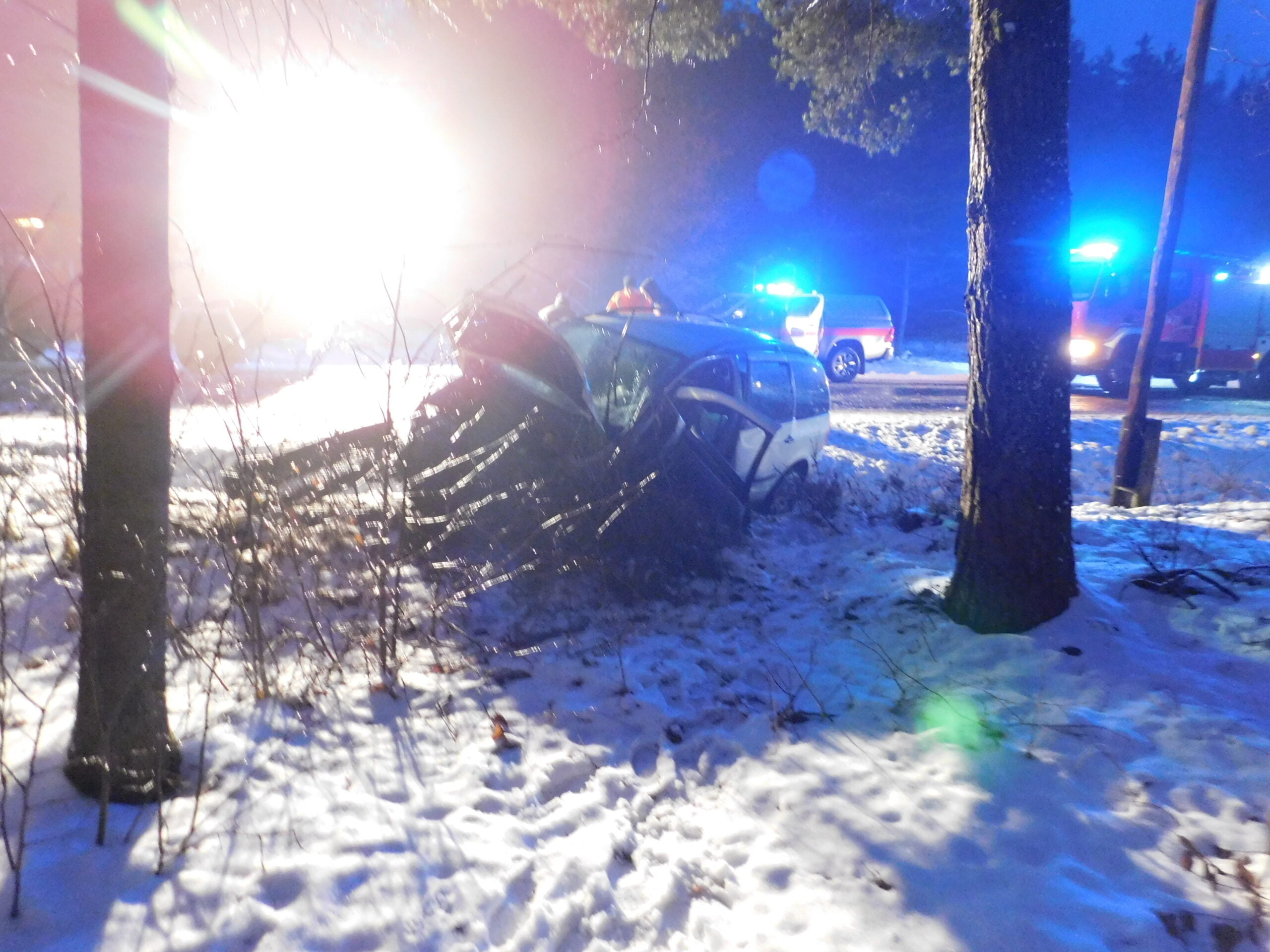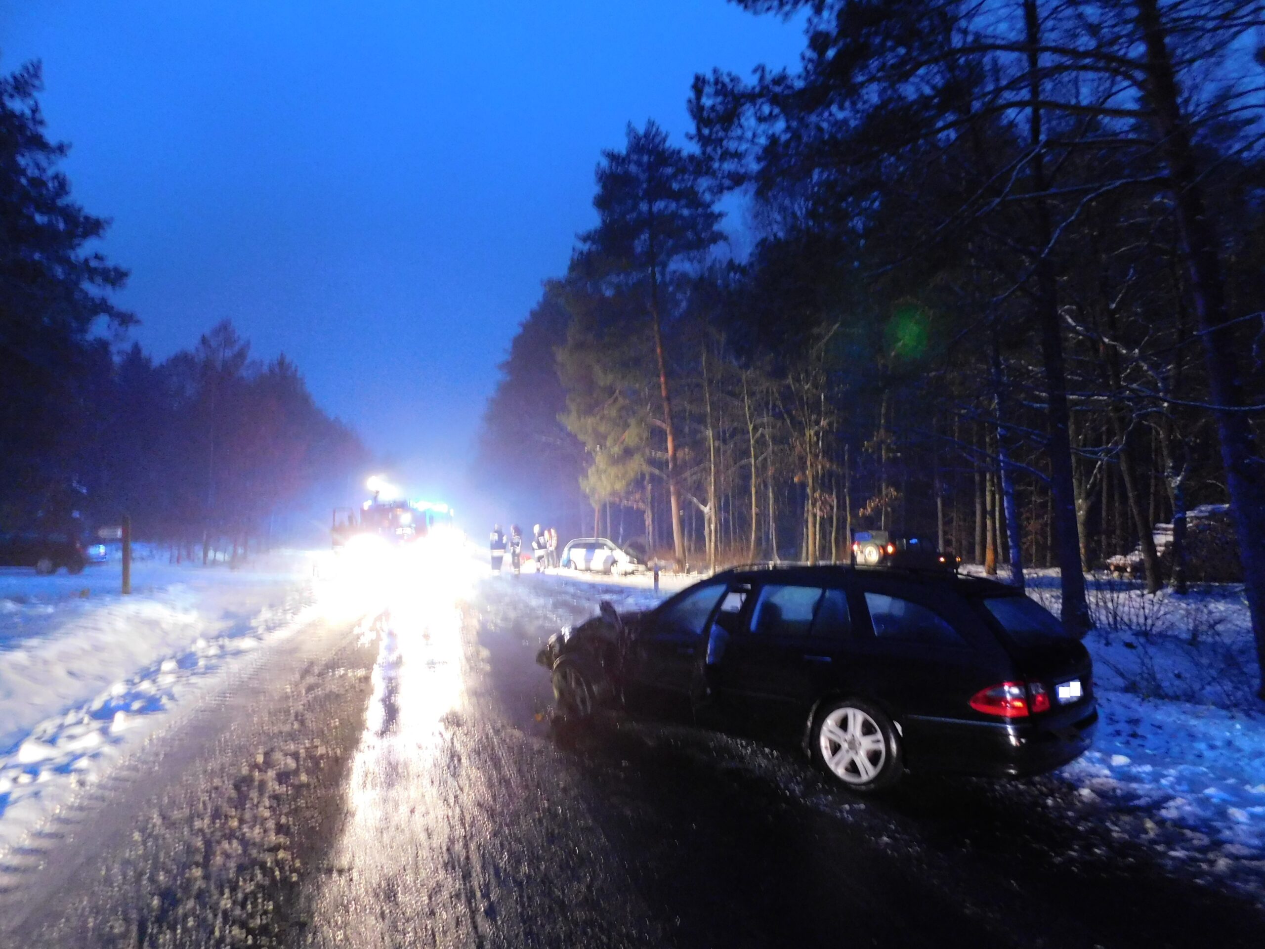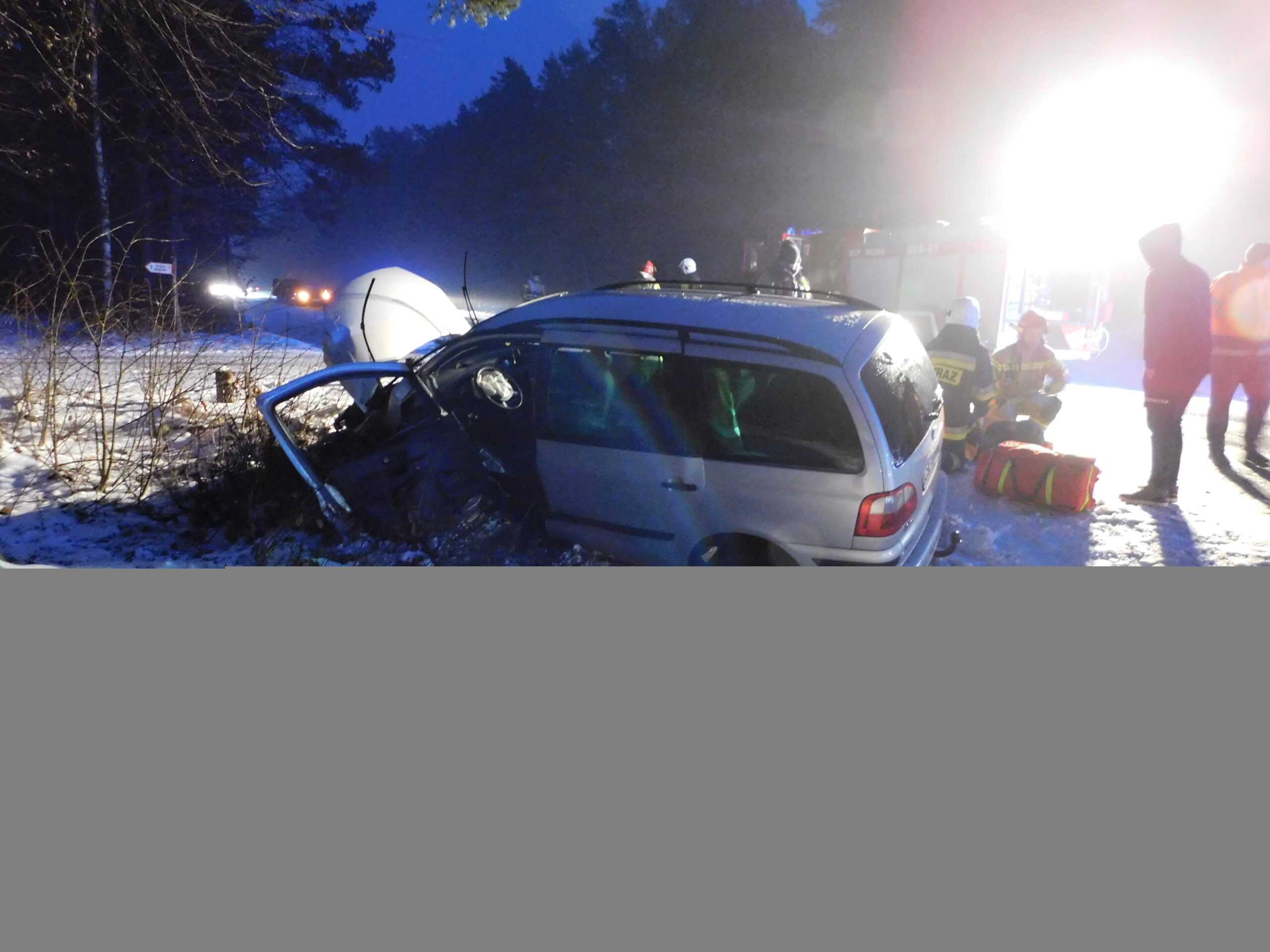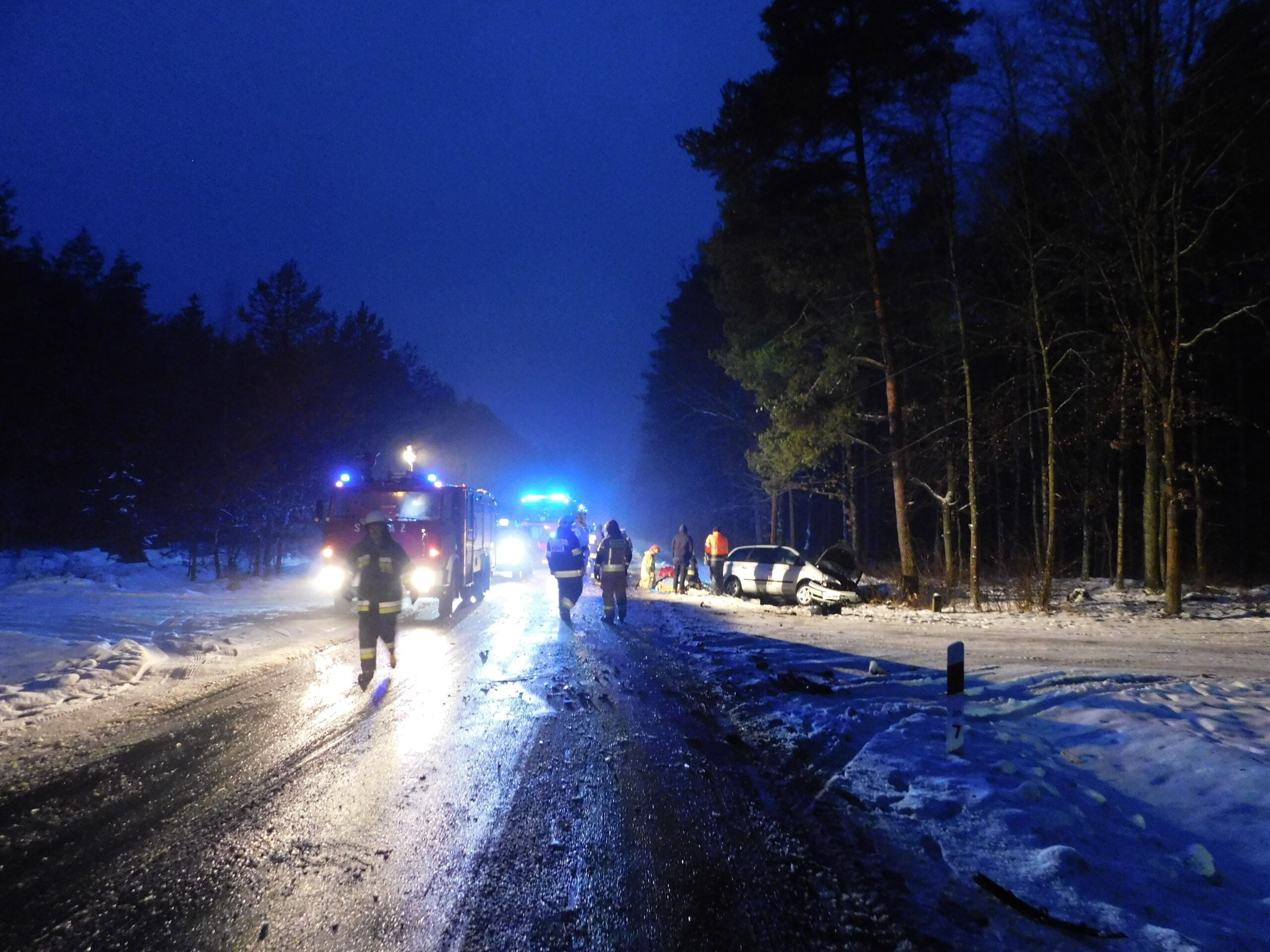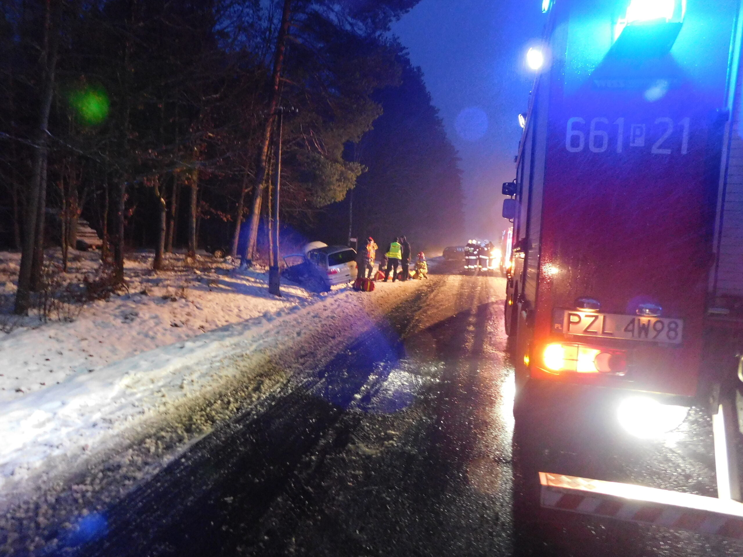 W chwili dojazdu służb ratowniczych jeden z rozbitych pojazdów zlokalizowany na pasie drogi, drugi zakończył przemieszczanie się w przydrożnym rowie. Wszystkie osoby podróżujące opuściły pojazdy o własnych siłach jednak wymagały udzielenia pomocy medycznej. Strażacy po zabezpieczeniu miejsca i wstrzymaniu ruchu na danym odcinku drogi przystąpili do udzielania pomocy poszkodowanym. W chwili przybycia pierwszego zespołu ratownictwa medycznego dwoje poszkodowanych zostało przejętych przez medyków trzecia z osób pozostawała nadal pod opieką strażaków do momentu przyjazdu drugiego zespołu PRM. W dalszej kolejności oświetlono teren działań do czasu wykonania czynności dochodzeniowych przez Policję oraz usunięcia pojazdów przez pomoc drogową. Zdarzenie łącznie obsługiwały cztery różne podmioty, w tym 10 pojazdów i 24 osoby.